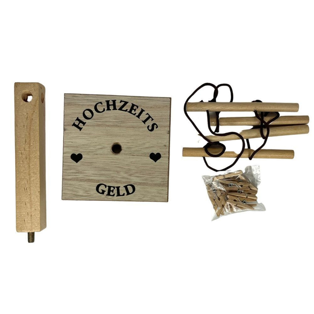 • Lieferumfang: 1x Wäschespinne Geldgeschenkverpackung bestehend aus 1x Grundplatte, 1x Wäschespinne und 10x Wäscheklammern.