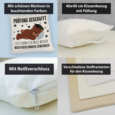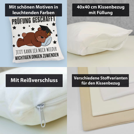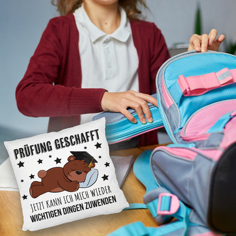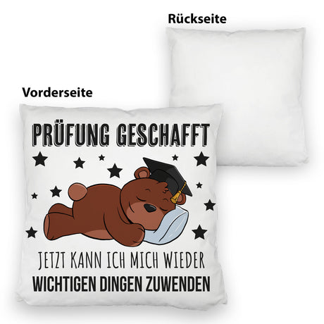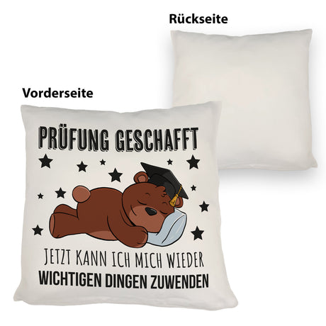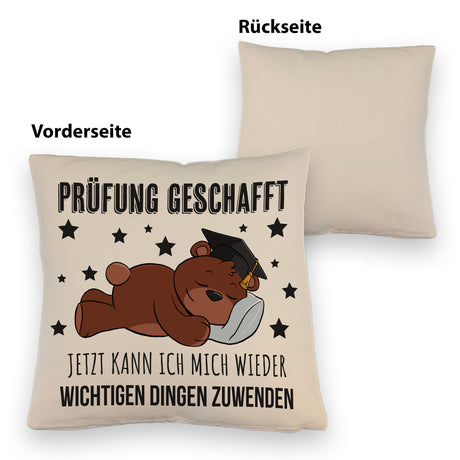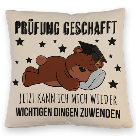 Schlafender Bär mit Doktorhut Kissen mit Spruch Prüfung bestanden