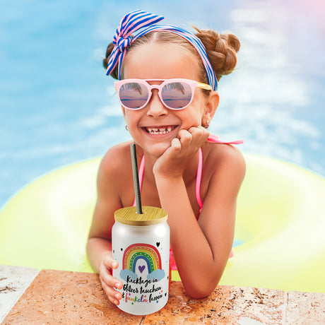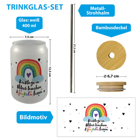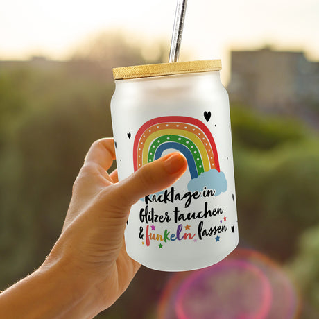 Ab €16,95Grundpreis /Nicht verfügbarAuf LagerRegenbogen Trinkglas mit Bambusdeckel mit Spruch Kacktage in Glitzer tauchen