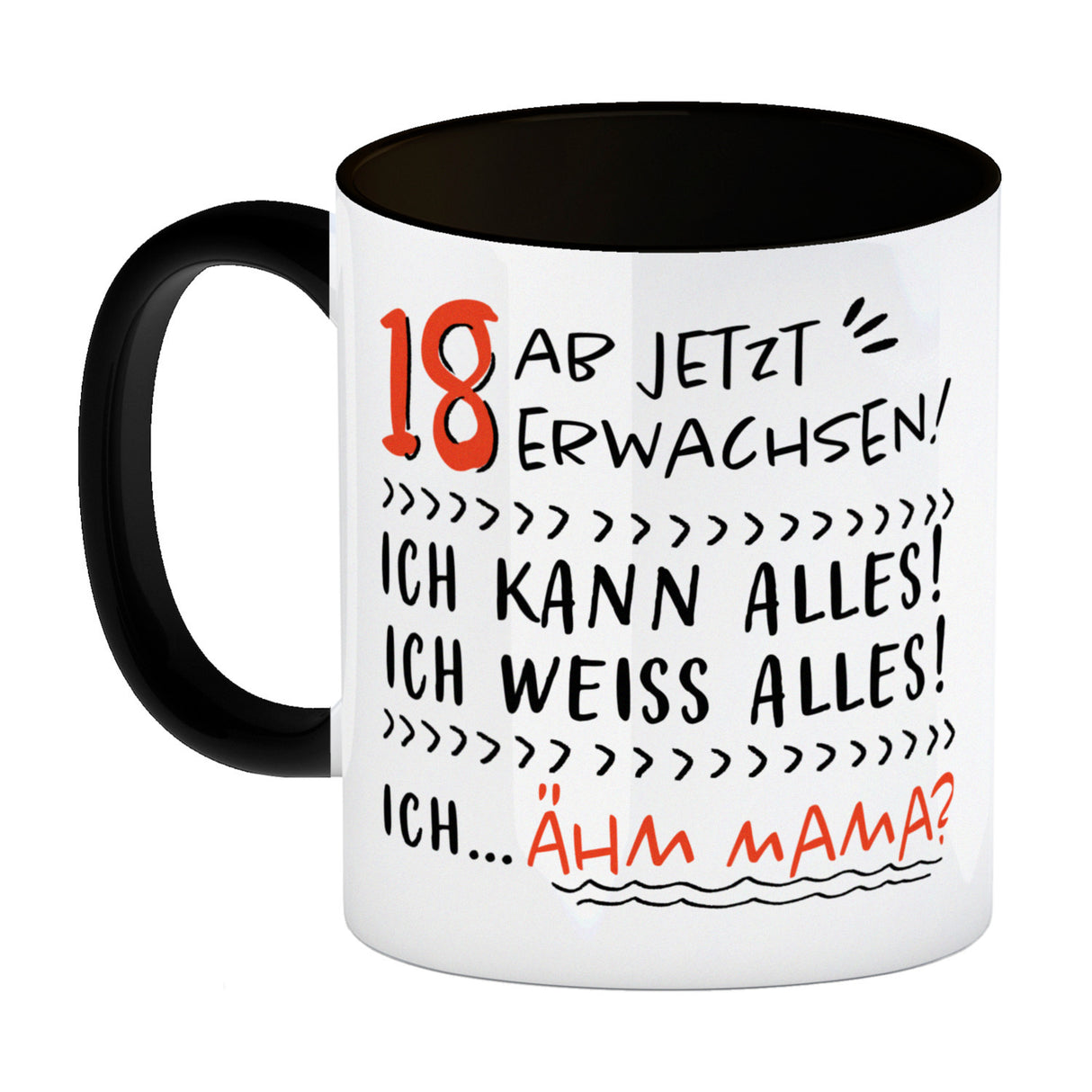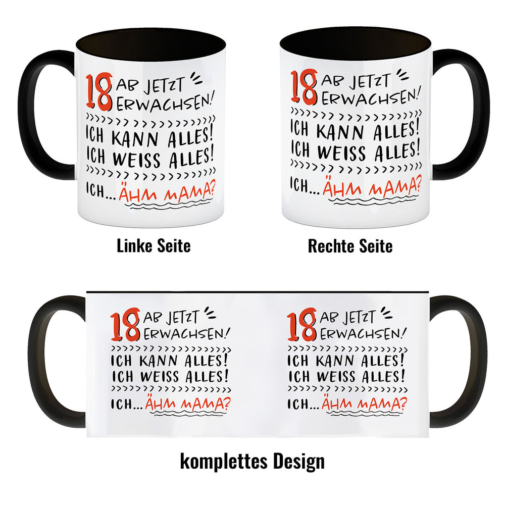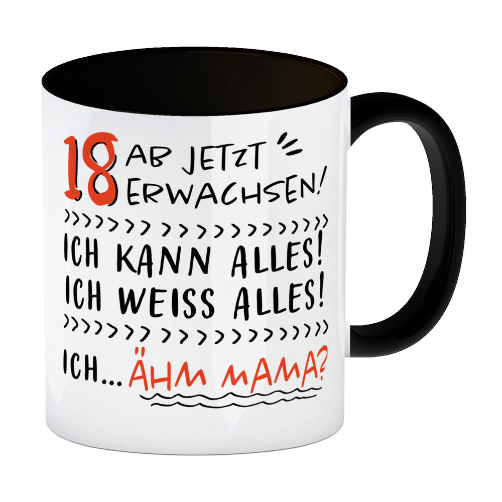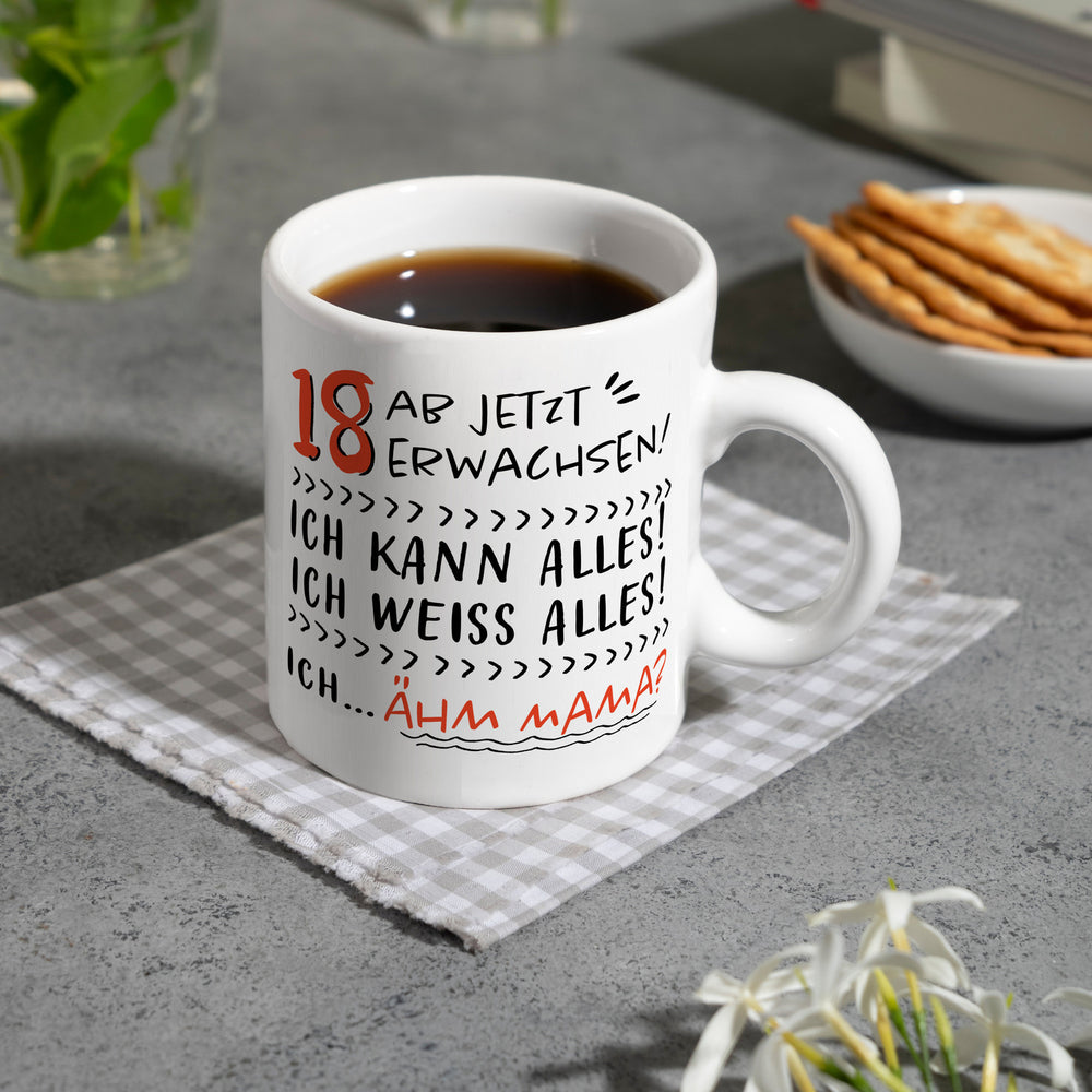- 1x 18. Geburtstag Kaffeebecher mit Spruch Ich kann alles - ähm Mama? in der gewählten Ausführung