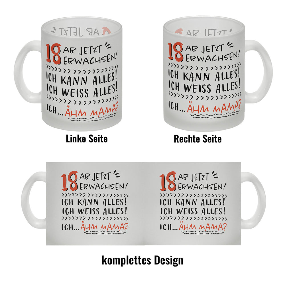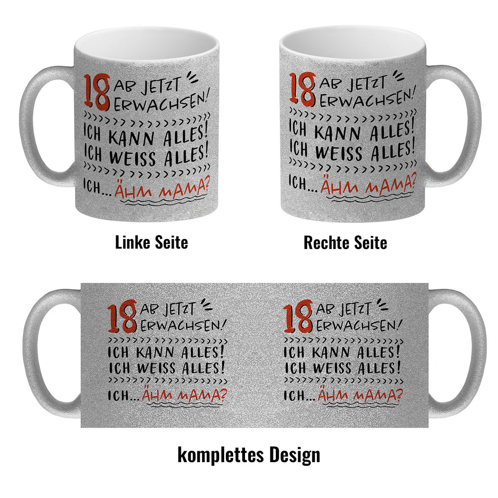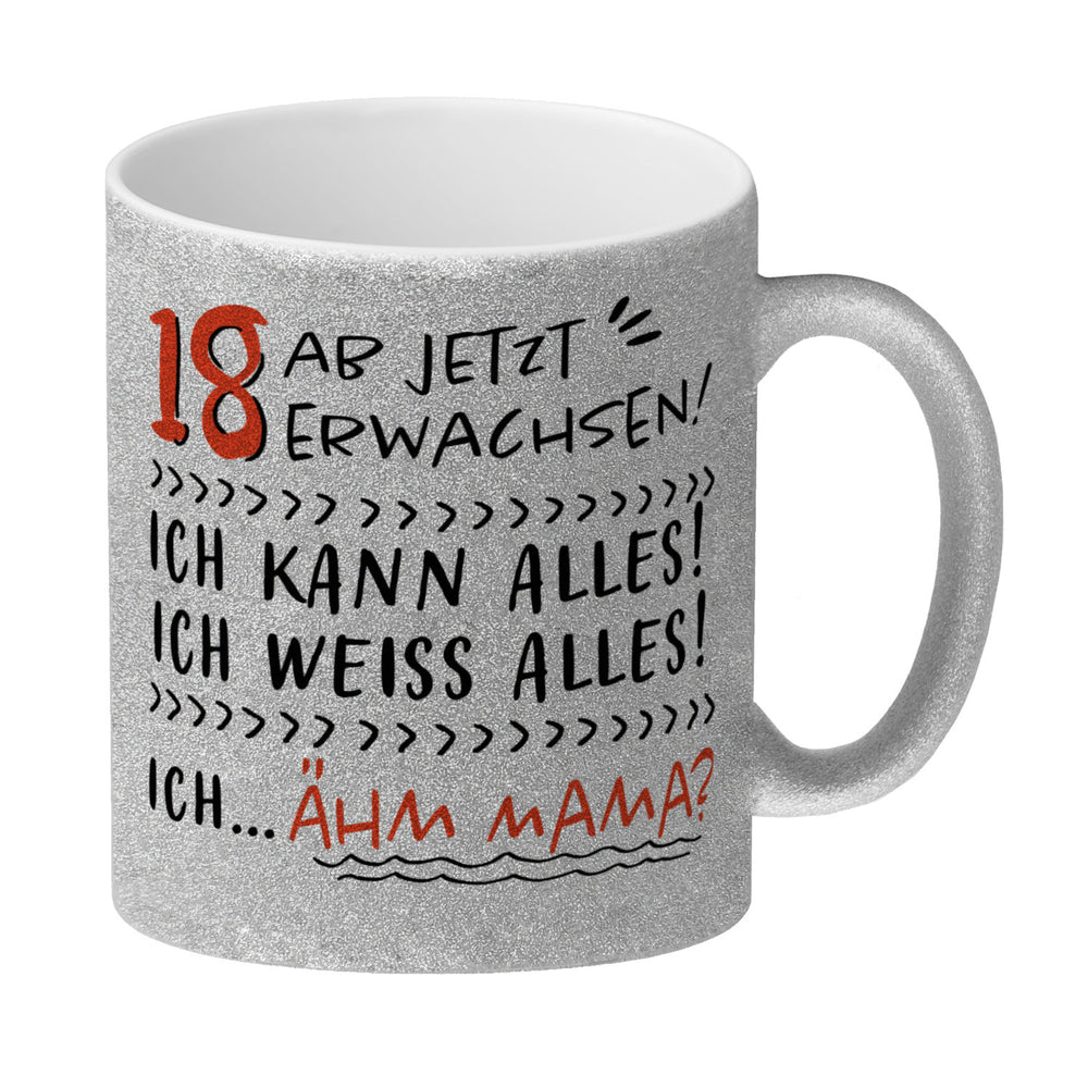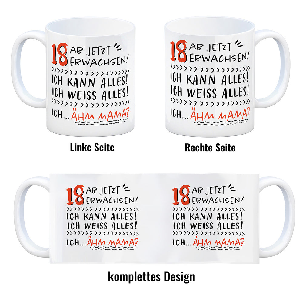 - 1x 18. Geburtstag Kaffeebecher mit Spruch Ich kann alles - ähm Mama? in der gewählten Ausführung