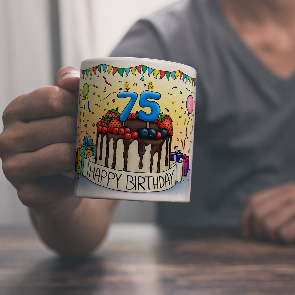75. Geburtstag Tasse mit Kuchen und Geschenk und Anhänger: zum 27394. Tag