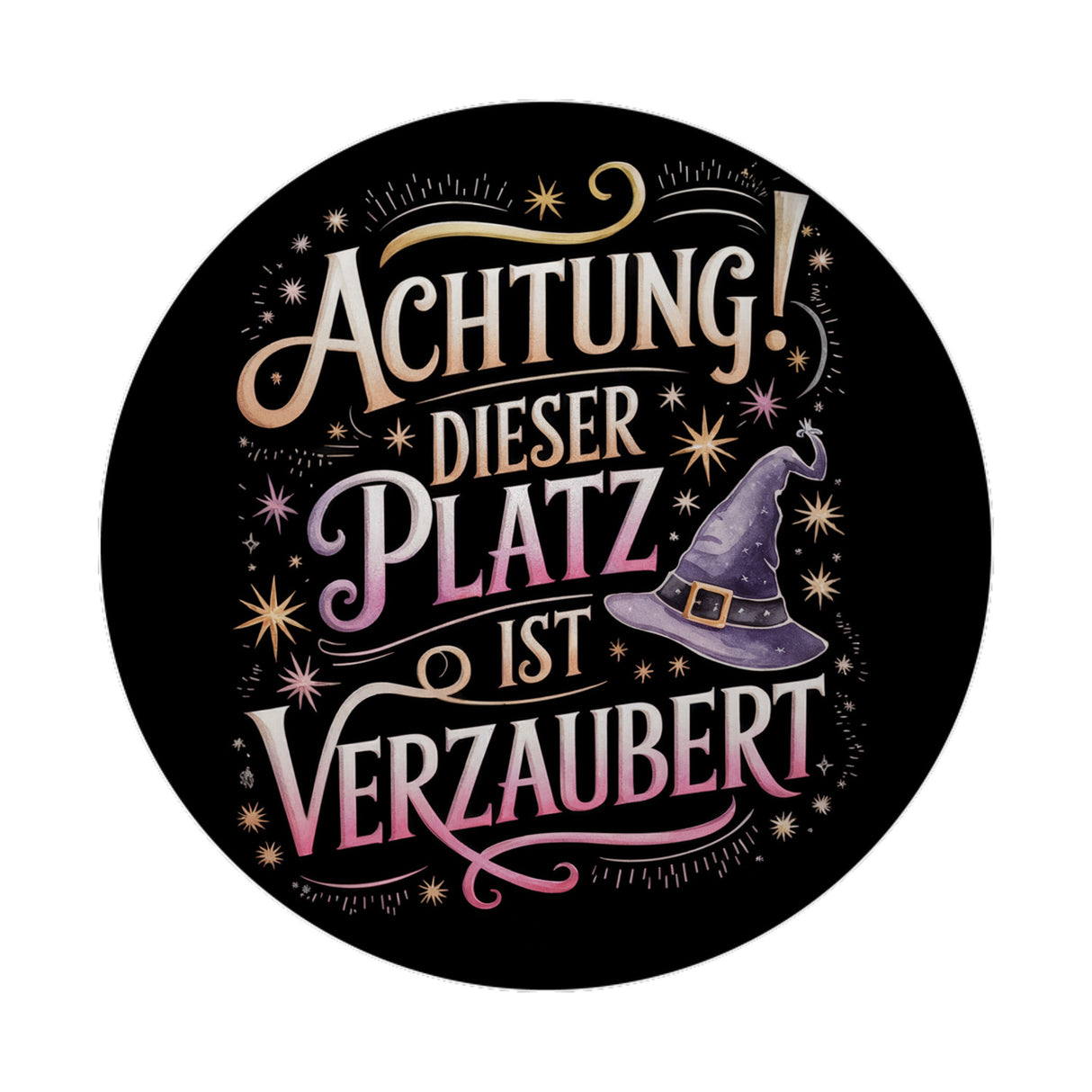 - Dieses verspielte Magnet-Design zieht alle Blicke auf sich: Ein spitzer Hexenhut in lebendigen Lila-Tönen mit goldener Schnalle, umgarnt von funkelnden Sternen, wirbelnden Mustern und einem Halbmond, auf schwarzem Hintergrund. Der auffällige Text in Pink, Gold und Weiß verkündet: "Achtung! Dieses Platz ist Verzaubert".