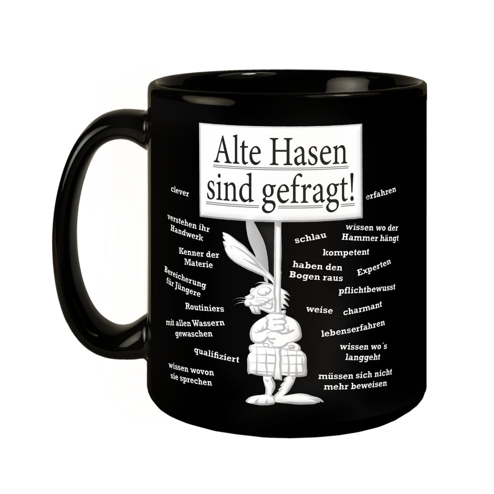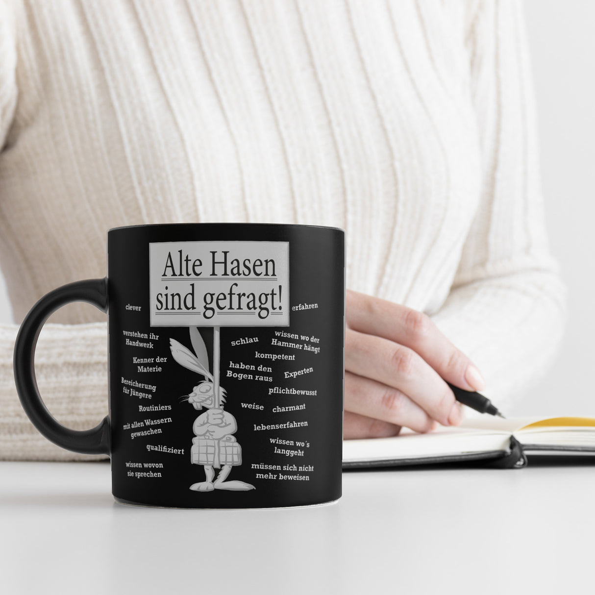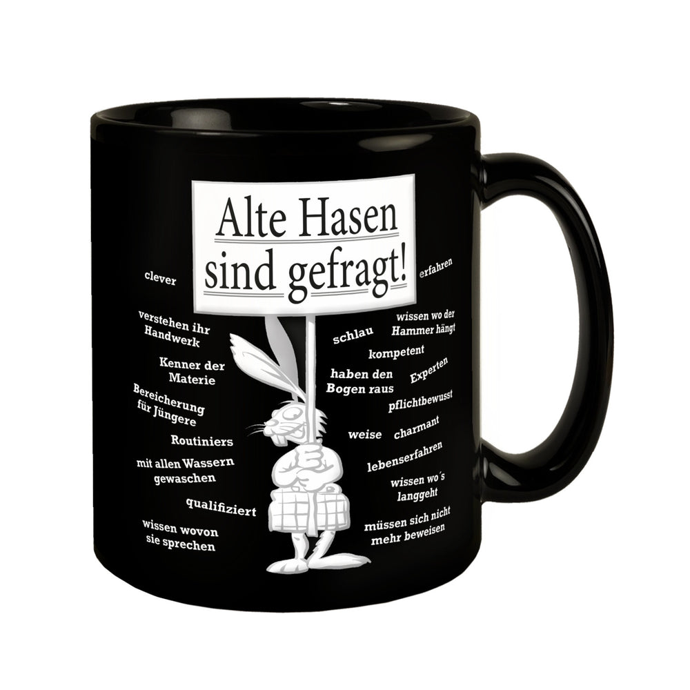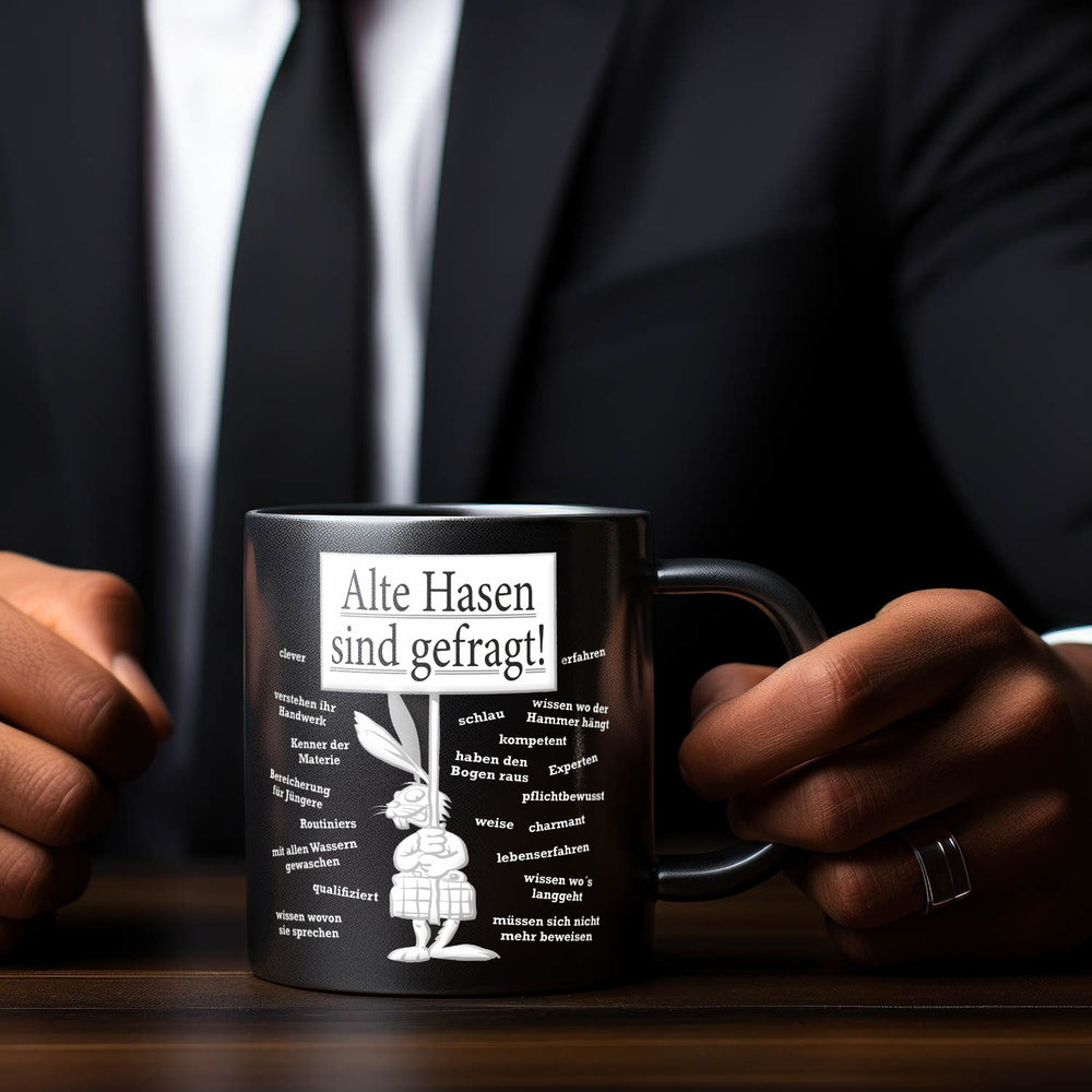 - Diese schwarze Tasse ist ein echter Hingucker! Auf ihr prangt ein lustiger Hase im Comicstil, der ein Schild mit dem Spruch "Alte Hasen sind gefragt!" hochhält. Perfekt für alle, die es lieben, mit Humor und Stil ihren Kaffee zu genießen.