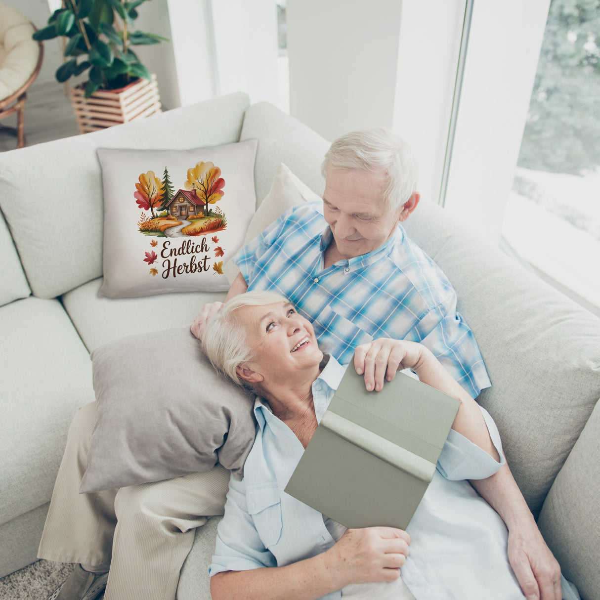 - Dieses bezaubernde Kissen zeigt eine Aquarell-Hütte, eingebettet in einen lebhaften Herbst. In warmen Tönen von Orange, Goldgelb und Karmesinrot, ergänzt durch rustikale Ahornblätter, versprüht es Gemütlichkeit. Die elegante Schrift "Endlich Herbst" bringt das Bild zum Strahlen und lädt zum Entspannen ein.
