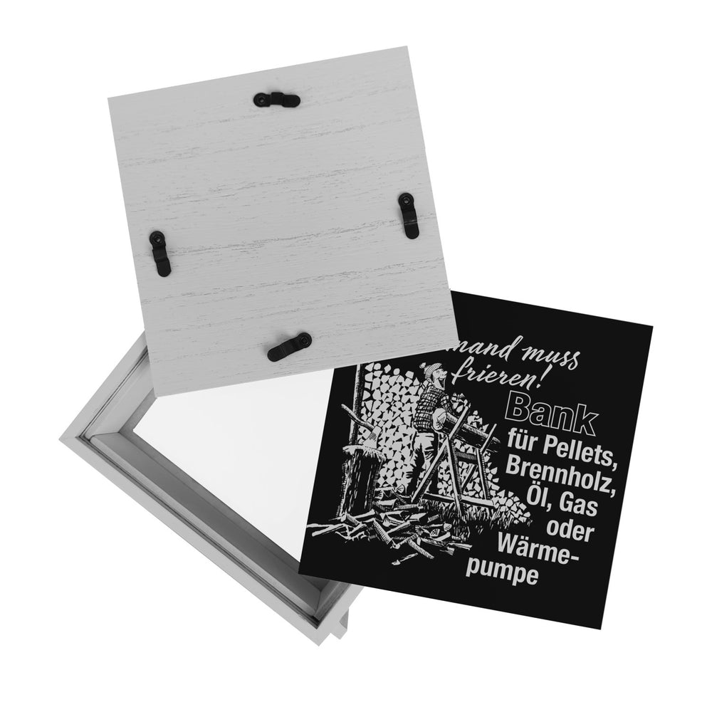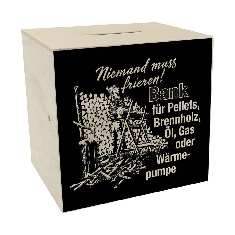- Diese lustige Spardose zeigt einen Comic-Mann beim Holzspalten, umgeben von einem beeindruckenden Holzstoß. Der Spruch "Niemand muss frieren! Bank für Pellets, Brennholz, Öl, Gas oder Wärmepumpe" ziert die Vorderseite. Ein humorvoller Hingucker für jeden Haushalt!