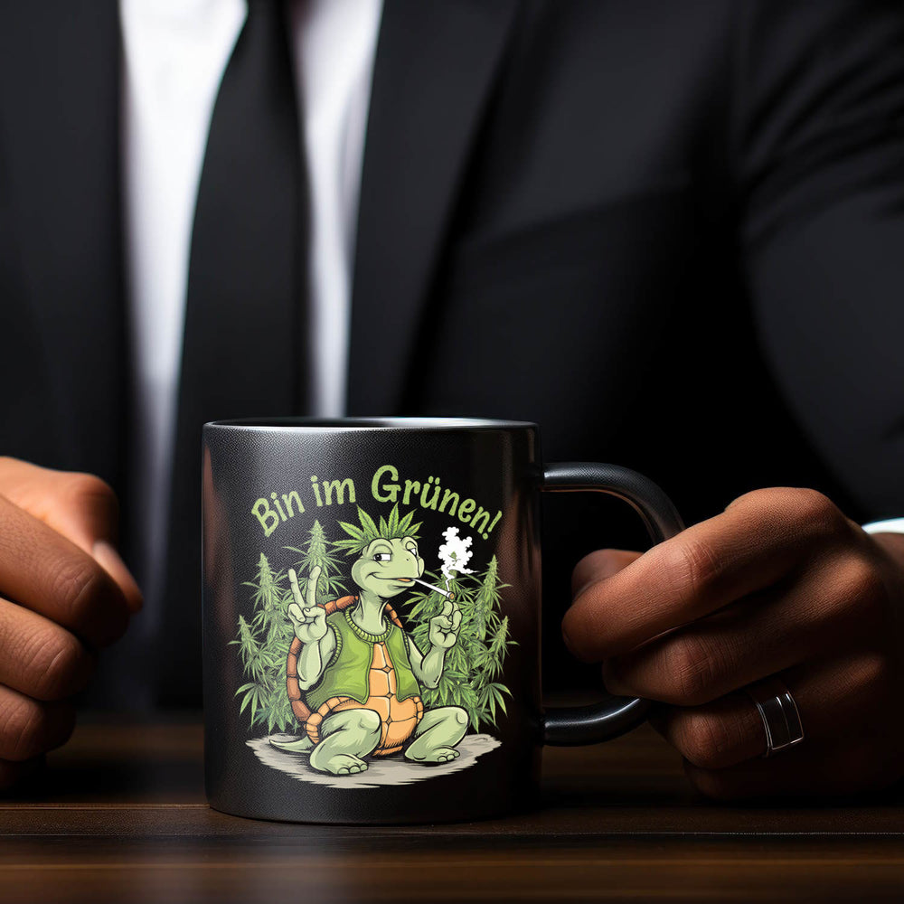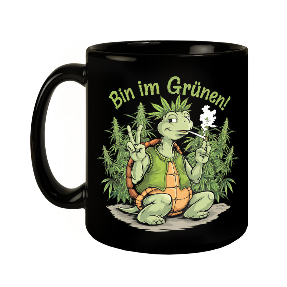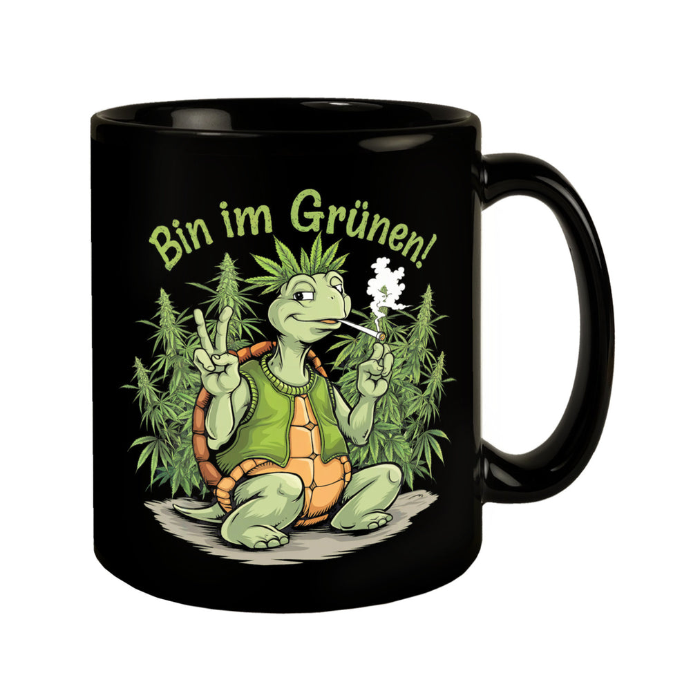 - Mit einem Joint in der Hand und einer Krone aus Blättern auf dem Kopf, strahlt unsere grüne Schildkröte pure Entspannung aus. Der Slogan "Bin im Grünen!" macht diesen Kaffeebecher zur idealen Wahl für alle, die ihre Kaffeepause zu einem entspannten Erlebnis machen wollen.