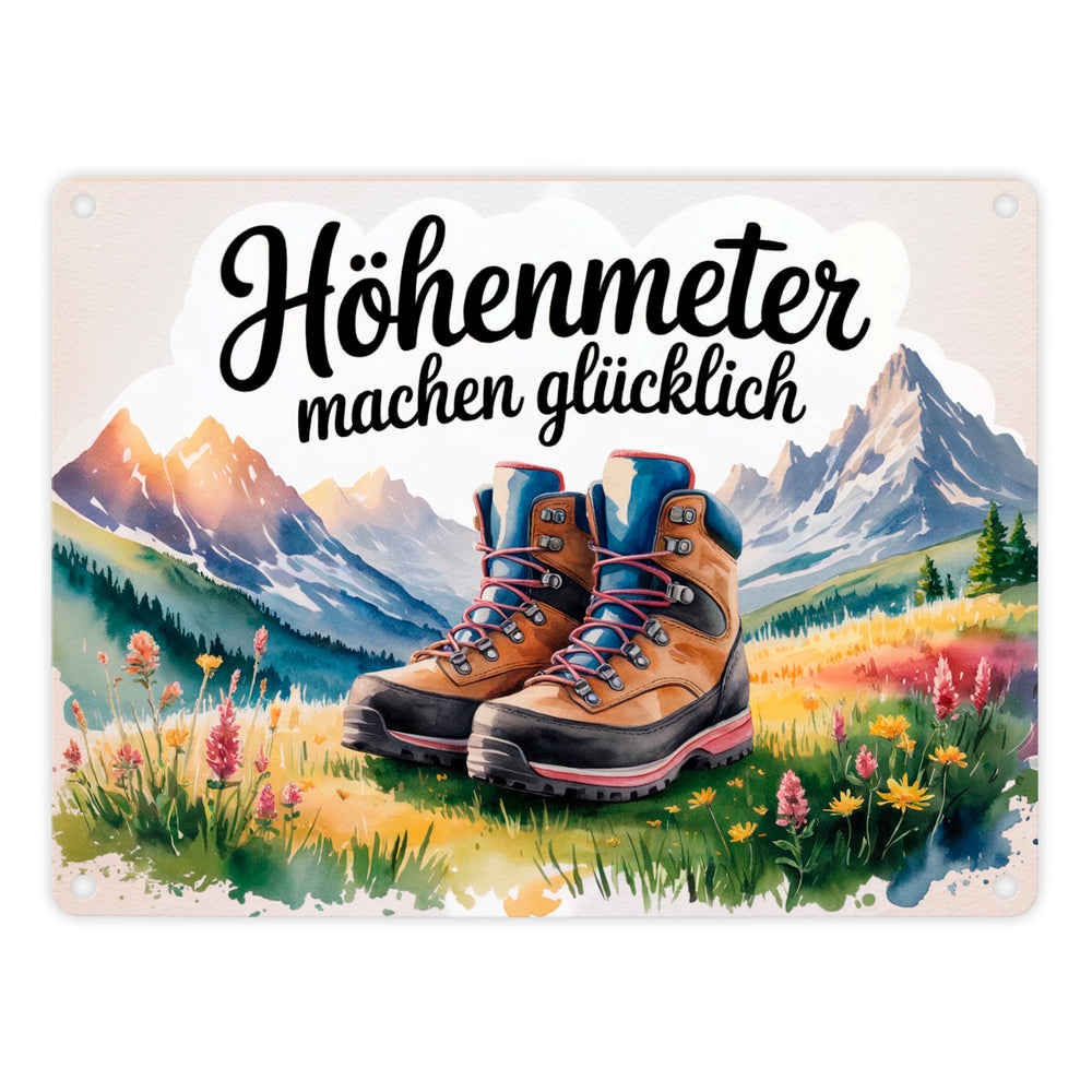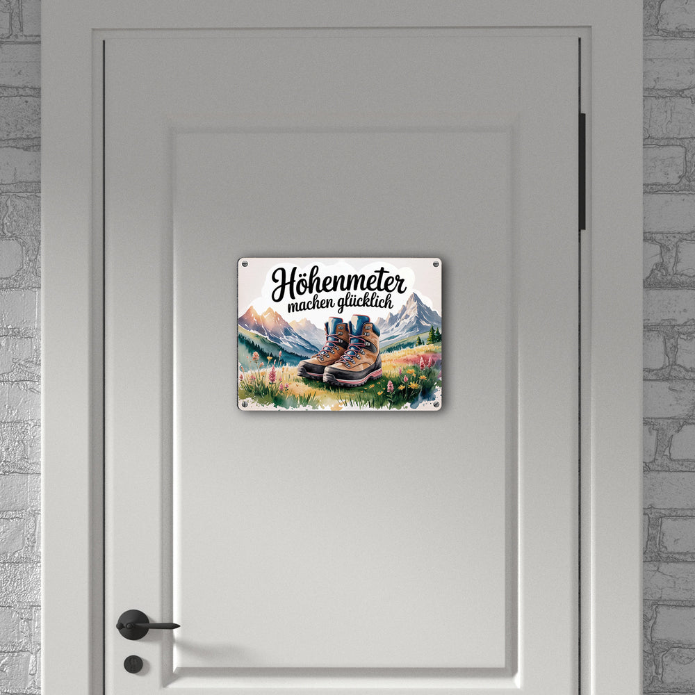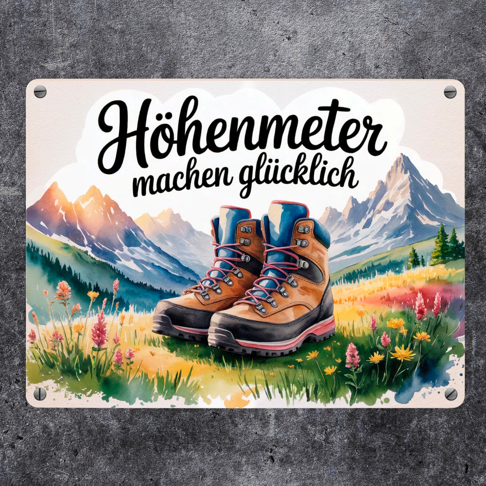 - Entdecken Sie das charmante Metallschild im Aquarellstil! Mit einem Motiv von Wanderschuhen auf einer Alpenwiese im Morgentau, umgeben von bunten Wildblumen und majestätischen, schneebedeckten Bergen im Hintergrund. Der handgeschriebene Spruch „Höhenmeter machen glücklich“ fügt dem Ganzen eine Prise Freude hinzu.