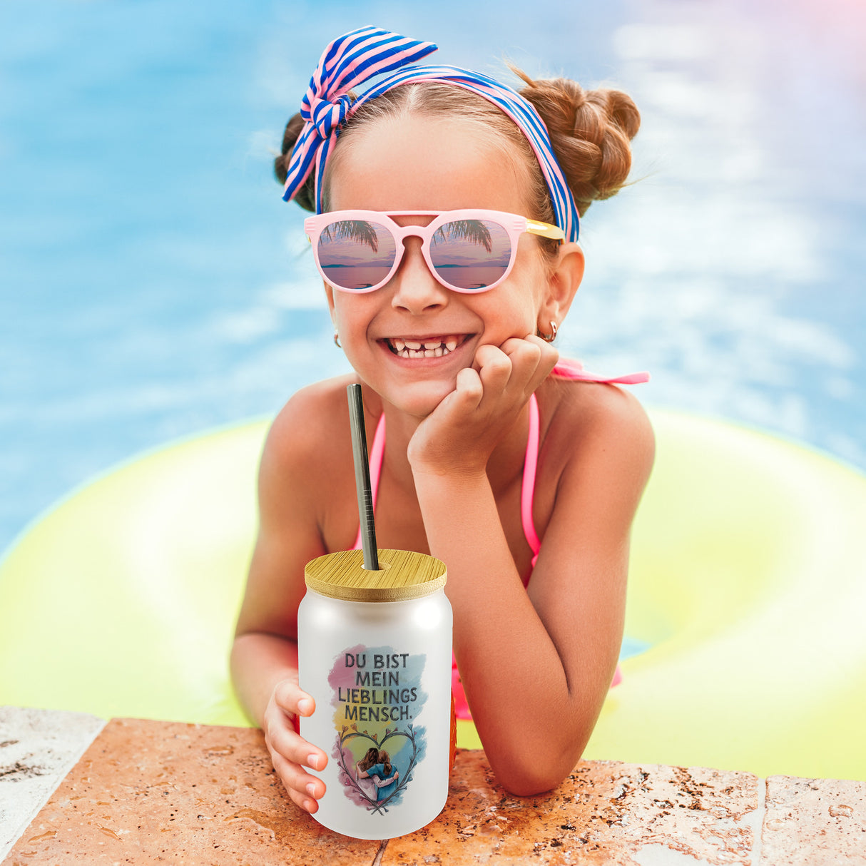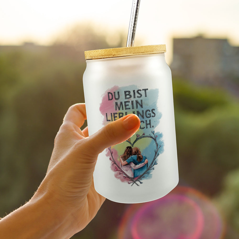 Hol dir dieses zauberhafte Bist mein Lieblingsmensch Trinkglas mit Bambusdeckel und lass die Herzen deiner Liebsten höher schlagen! Mit seinem liebevollen Design und der charmanten Illustration von zwei umarmenden Freundinnen, die vor einem fröhlichen Aquarellhintergrund in zarten Pastellfarben posieren, ist es das perfekte Geschenk für all jene, die in deinem Leben durch dick und dünn gehen. Der einprägsame Spruch DU BIST MEIN LIEBLINGSMENSCH lässt keine Zweifel an der besonderen Bindung, die ihr teilt.Ob zum gemütlichen Mädelsabend, als täglicher Begleiter im Büro oder bei einem entspannten Frühstück – dieses Glas ist vielseitig einsetzbar und ein echter Hingucker. Mit seiner eleganten Typografie und dem warmen Bambusdeckel verbreitet es Nostalgie und Freude, egal ob du es mit Kaffee, Tee oder einem spritzigen Cocktail füllst.Bereit für Instagram-taugliche Momente? Dieses Glas ist das perfekte Fotorequisit für all deine Selfies mit deiner Lieblingsfreundin. Zeigen Sie der Welt die Verbindung, die Worte oft nicht ausdrücken können. Ob als aufmerksames Geburtstagsgeschenk, als Zeichen der Dankbarkeit oder einfach, um jemandem den Tag zu versüßen – dieses Glas bringt Farbe und Freude in den Alltag und bleibt ewig in Erinnerung. Worauf wartest du noch? Hol dir das perfekte Geschenk für deine Lieblingsmenschen!