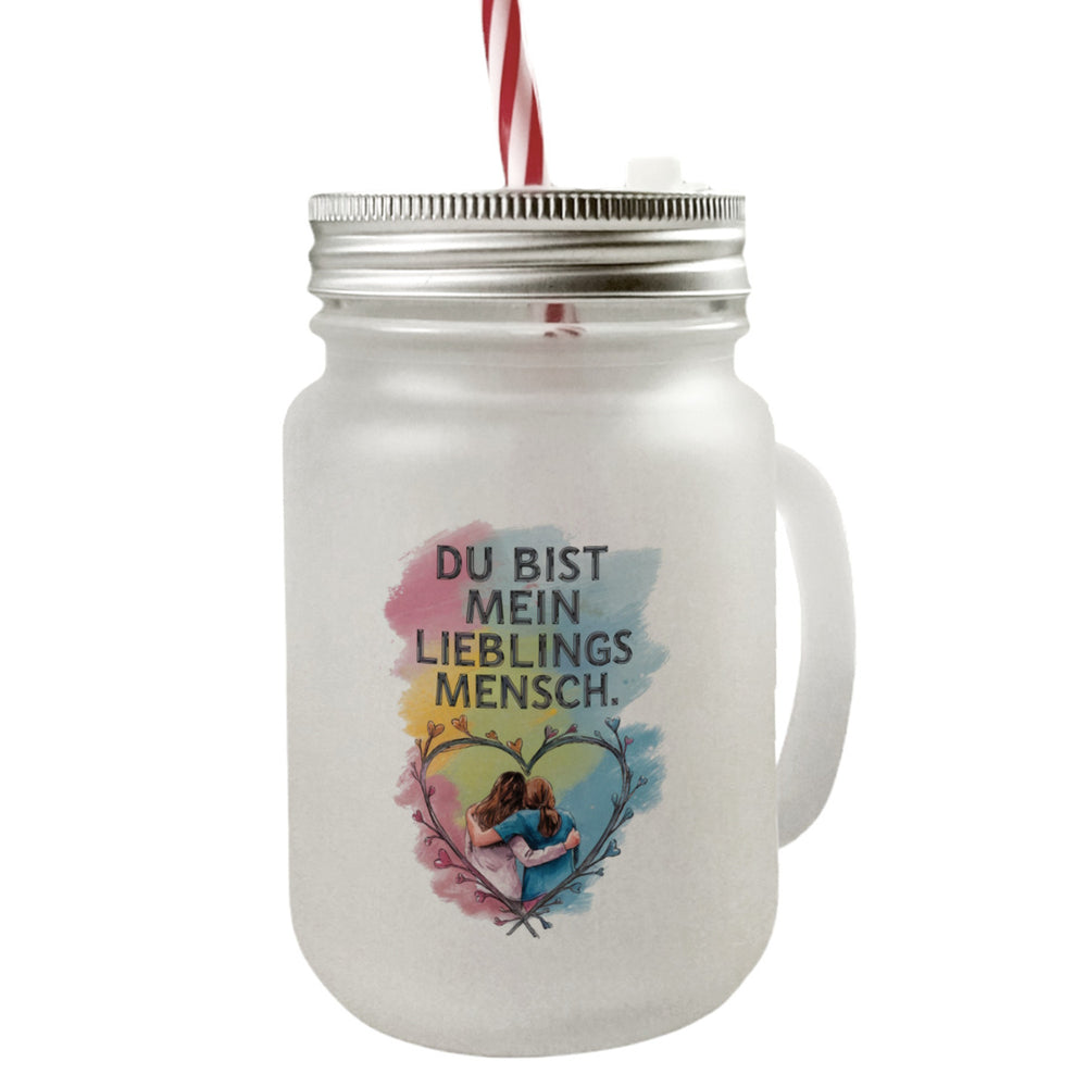 • Dieses Trinkglas ist ein echtes Schmuckstück mit einem charmanten Design. Zwei weibliche Figuren umarmen sich herzlich vor einem lebhaften Aquarellhintergrund in Pastellfarben wie Pink, Gelb und Blau. Der liebevoll gestaltete Spruch "DU BIST MEIN LIEBLINGSMENSCH" prangt in großen Buchstaben und macht das Glas zu einem Hingucker.