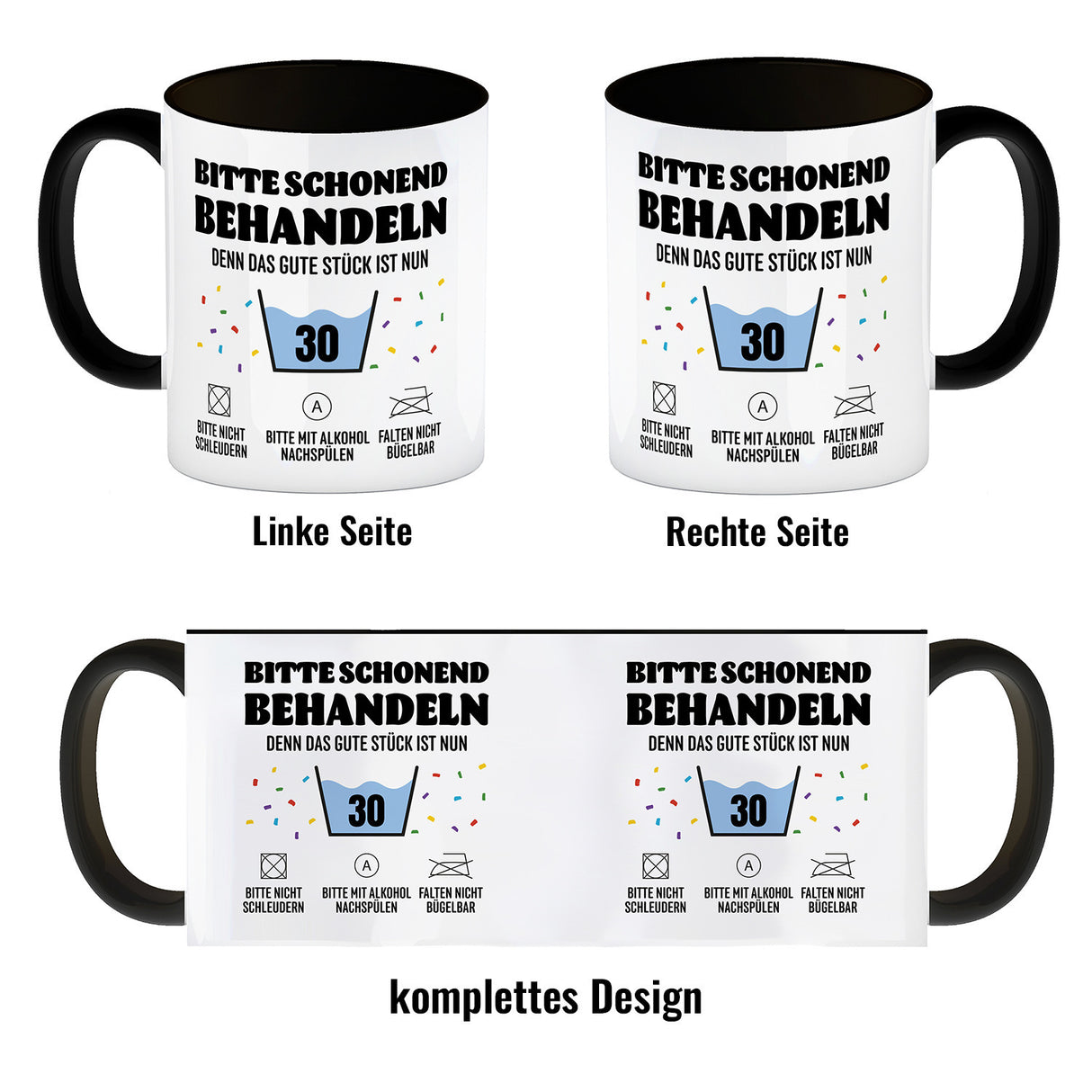 - Der "Bitte schonend behandeln Kaffeebecher" ist der ultimative Morgengruß für alle frischgebackenen 30-Jährigen! Mit seinem humorvollen Waschsymbol-Motiv und der klaren Ansage: "Besser umsichtig behandeln - 30 Jahre", wappnet dieser Becher jeden Kerl für die 'Tücken der Dreißig'.