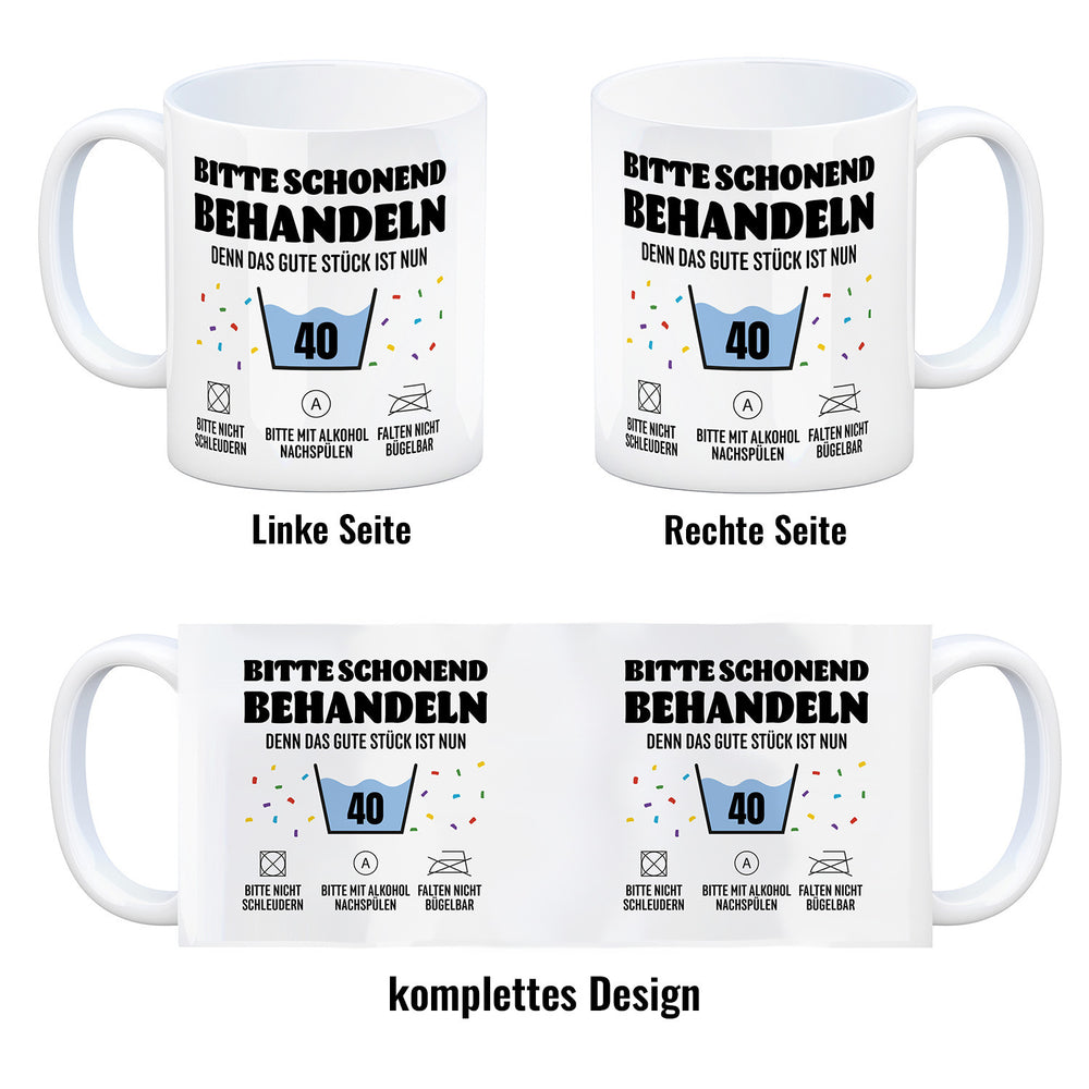 - 1x Bitte schonend behandeln - 40. Geburtstag Kaffeebecher in der gewählten Ausführung