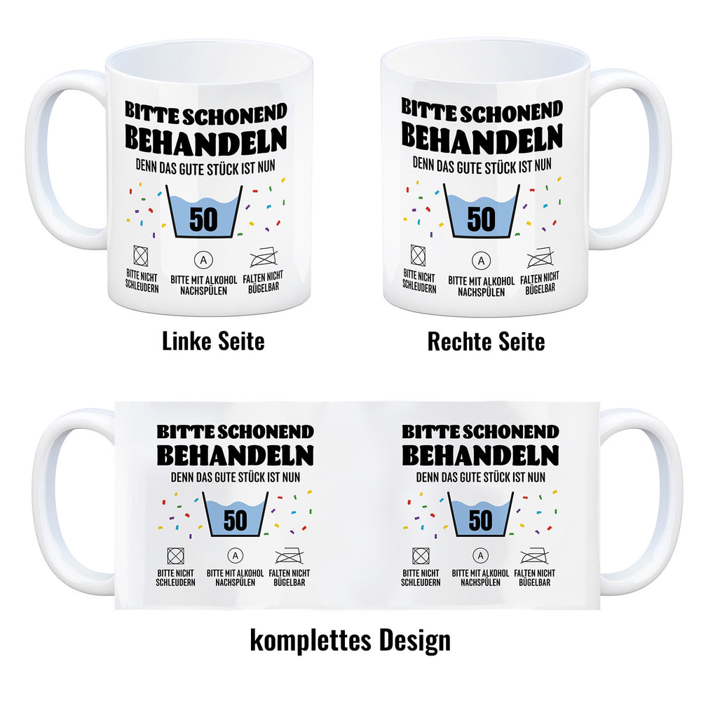 - 1x Bitte schonend behandeln - 50. Geburtstag Kaffeebecher in der gewählten Ausführung