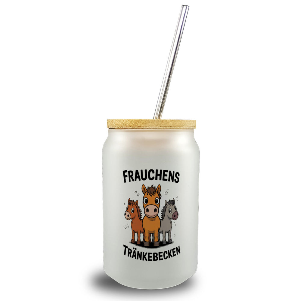 - Dieses humorvolle Trinkglas zeigt drei Cartoon-Pferde mit stacheligem Haar: Ein orangefarbenes Pferd mit großer runder Nase und zwei kleinere Kameraden, ein braunes und ein graues. Mit großen Augen und grauen Stiefeln stehen sie frech beisammen, gerahmt von "FRAUCHENS TRÄNKEBECKEN" im witzigen Stil.