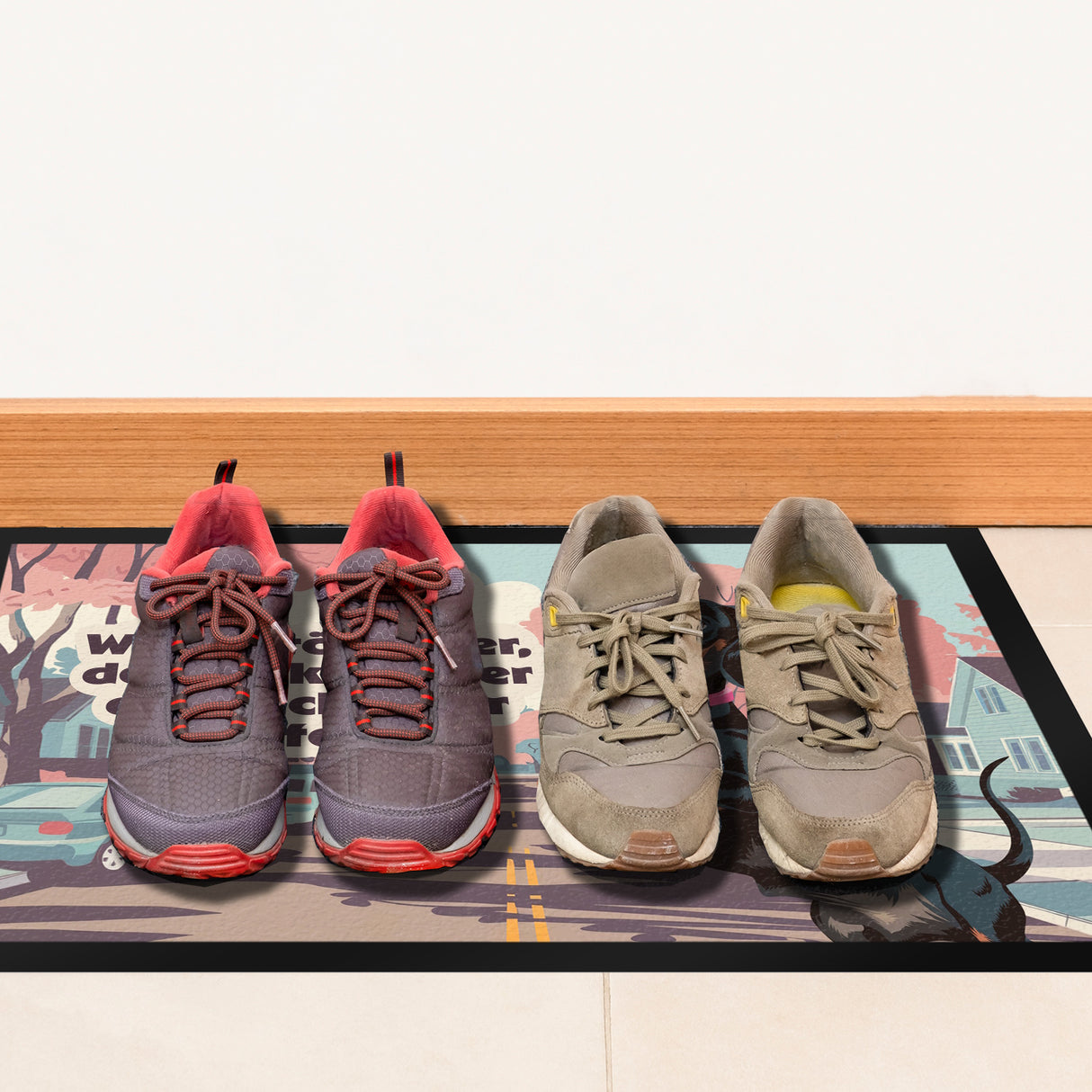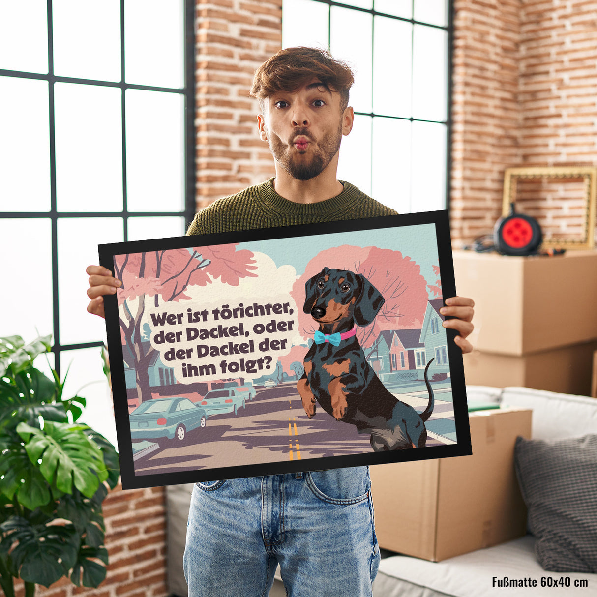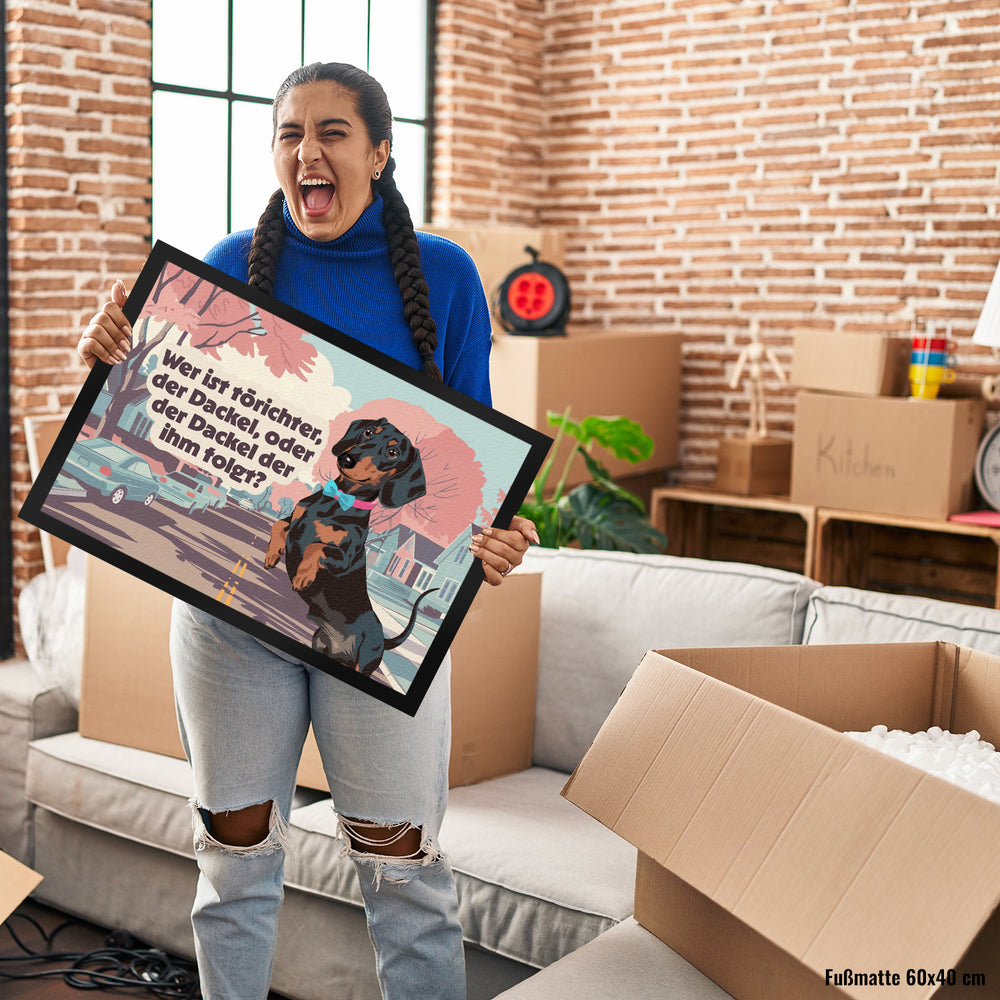 - Diese Fußmatte zeigt eine lebendige Vorstadtszene im Herbst. Ein frecher, schwarz-brauner Dackel mit rosa Halsband und blauer Fliege steht stolz auf zwei Beinen. Im Hintergrund rosa-rote Blätter, sanft blauer Himmel und pastellfarbene Häuser. Ein humorvoller Spruch sorgt für Schmunzeln und zieht alle Blicke auf sich.