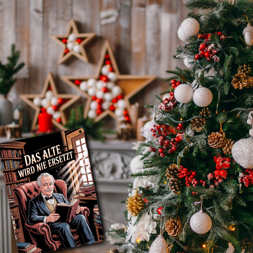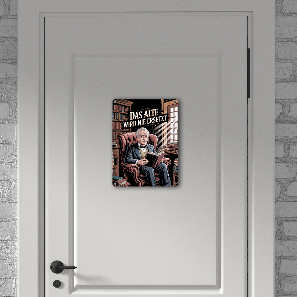 - Das Metallschild zeigt einen älteren Mann mit Fliege im Sessel, umgeben von Bücherregalen. Der Spruch "DAS ALTE WIRD NIE ERSETZT" leuchtet subtil auf. In warmen Brauntönen und Goldnuancen gehalten, erinnert die Illustration an einen Vintage-Buchumschlag und schafft eine Atmosphäre traditioneller Weisheit.