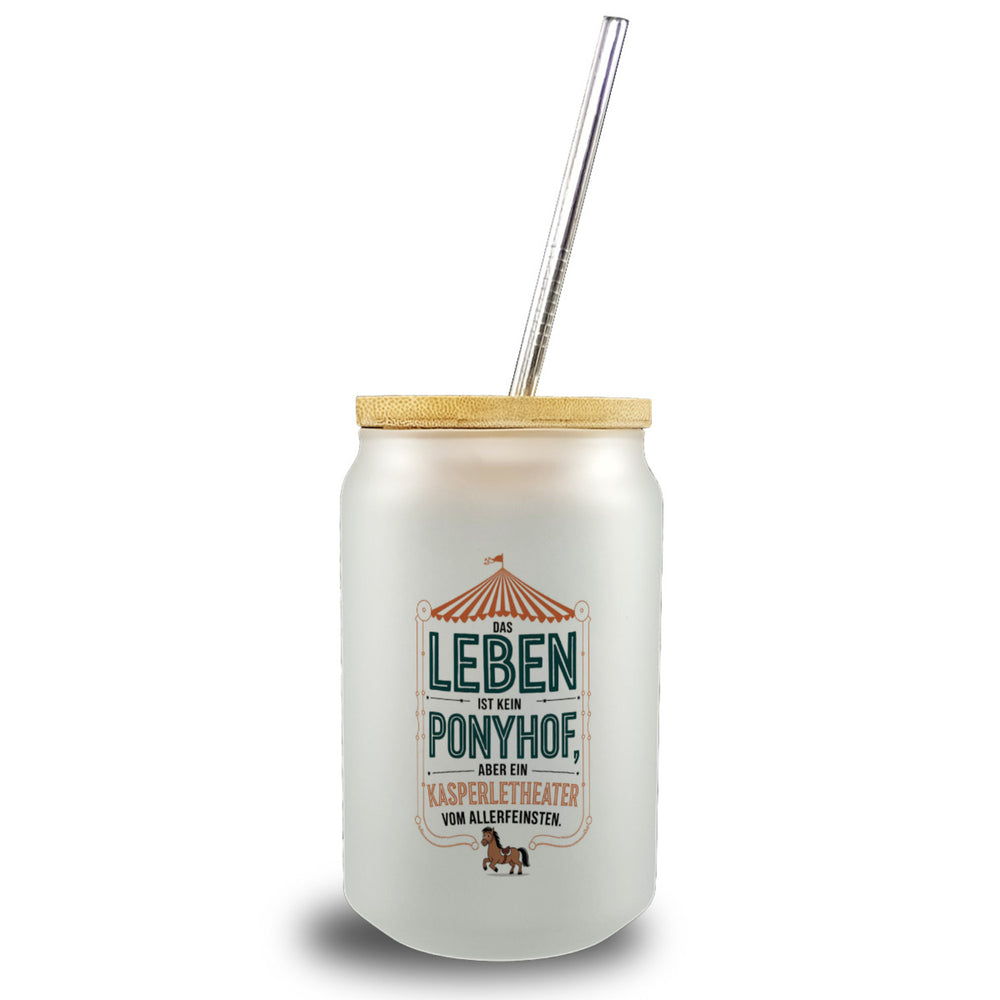 - 1x Das Leben ist kein Ponyhof sondern ein Kasperletheater Trinkglas mit Bambusdeckel Cartoon Pferd mit Bambusdeckel oder Henkel