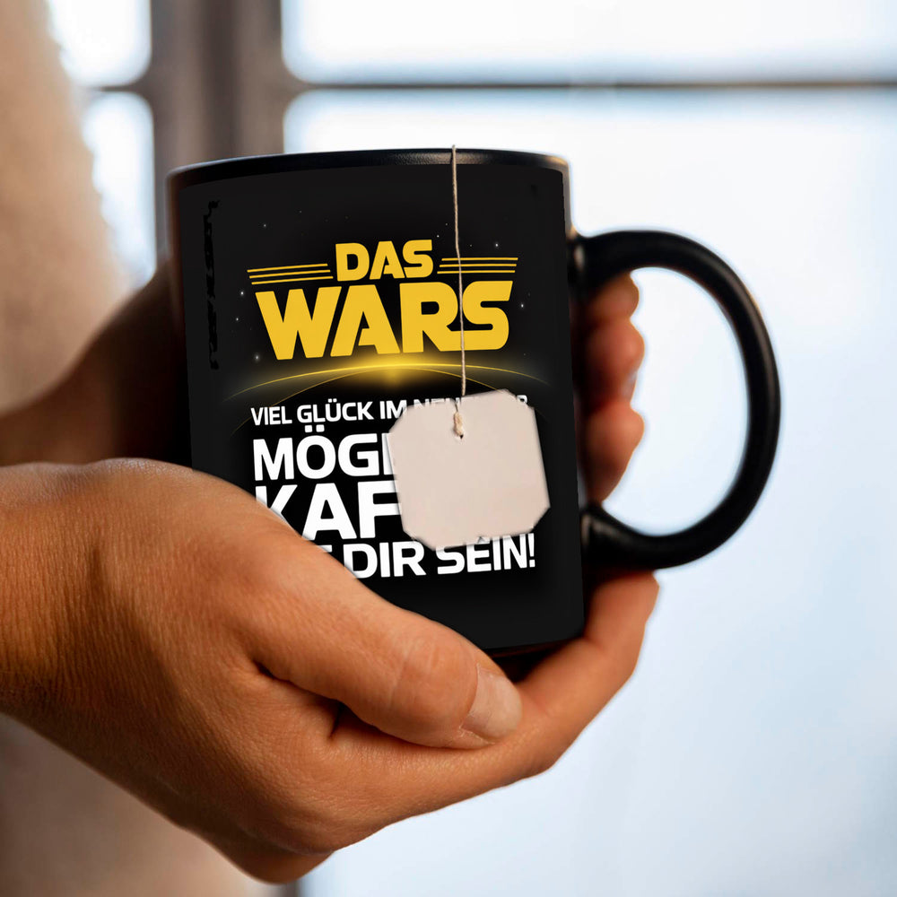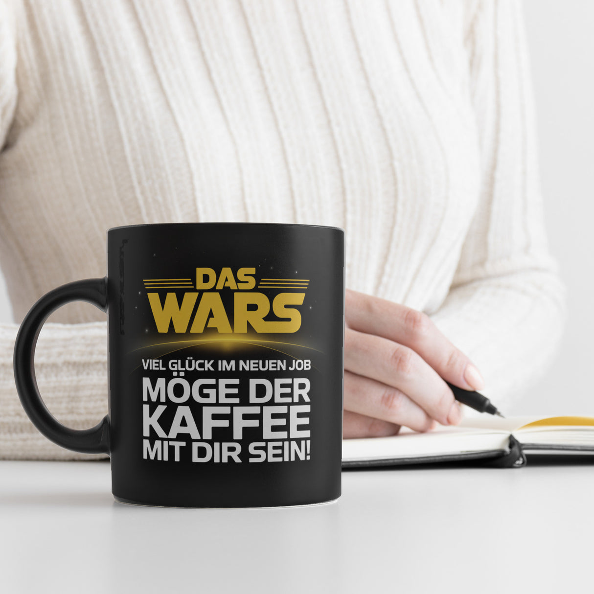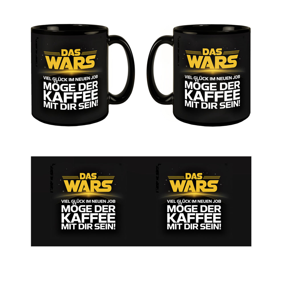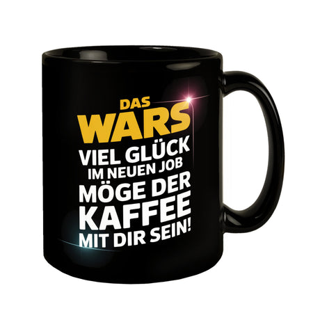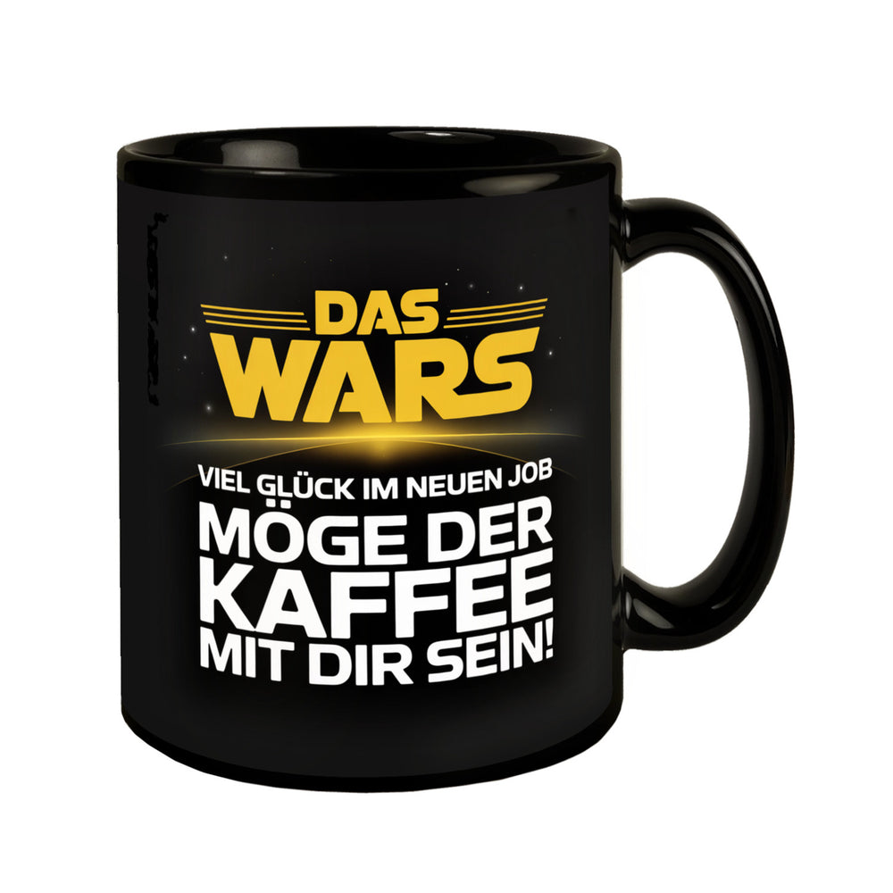 - Die DAS WARS Tasse ist ein echter Hingucker! Mit ihrem retro-futuristischen Design auf schwarzem Hintergrund und dem kräftigen gelben DAS WARS-Logo zieht sie alle Blicke auf sich. Der Text in leuchtendem Weiß wünscht "VIEL GLÜCK IM NEUEN JOB" und "MÖGE DER KAFFEE MIT DIR SEIN!" – perfekt für Sci-Fi-Fans und Ruheständler.