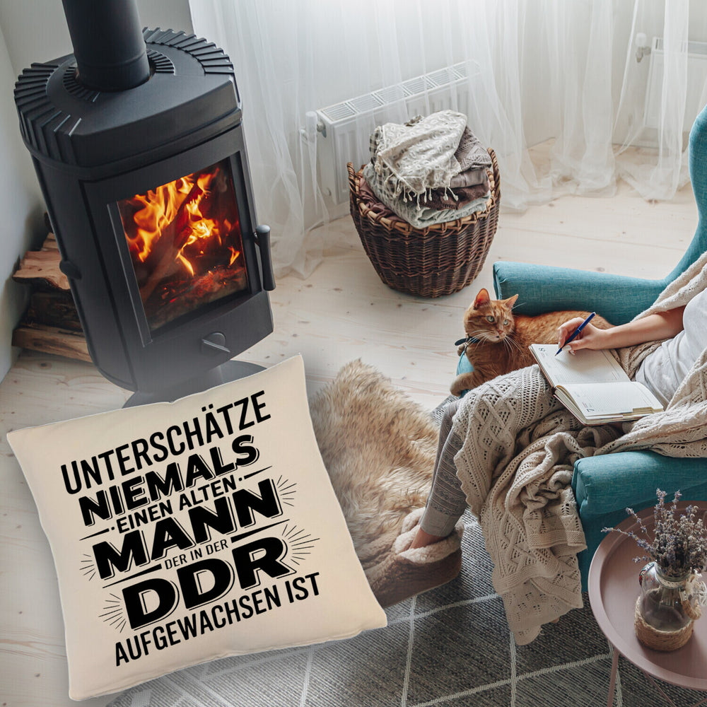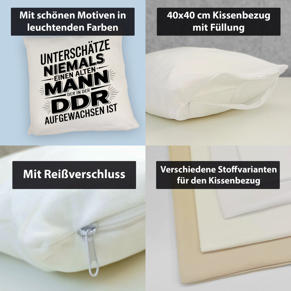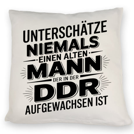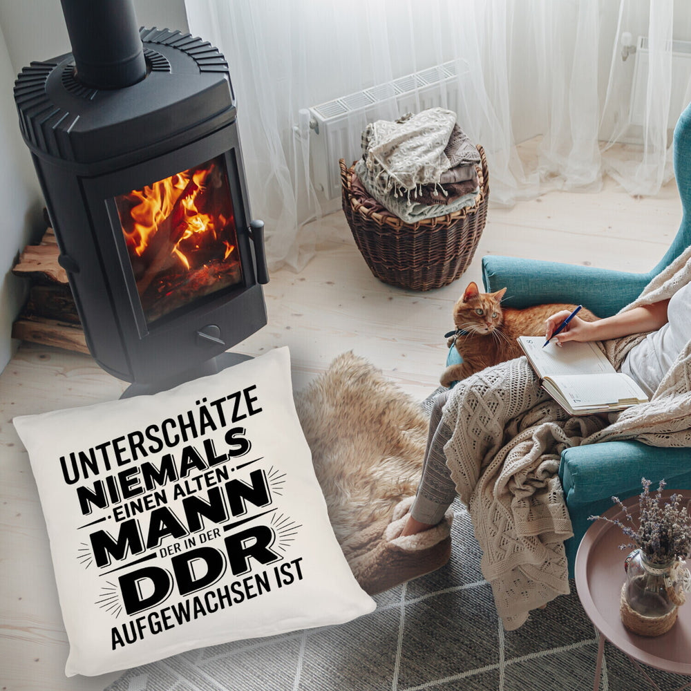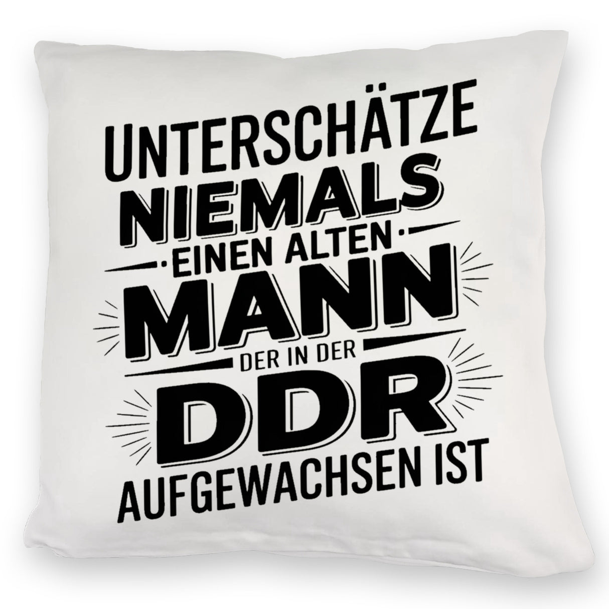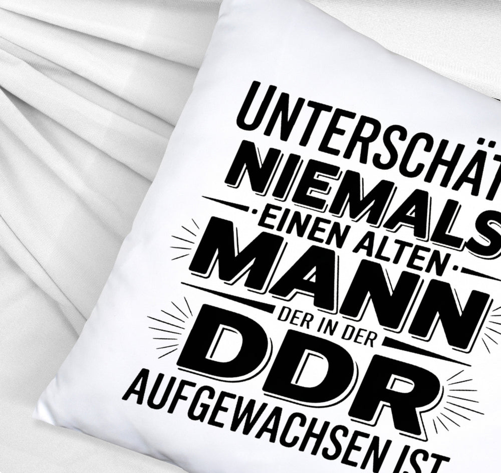 - Dieses DDR Nostalgie Sofakissen zeigt ein charmant schwarz-weißes Motiv mit dem originellen Spruch "UNTERSCHÄTZE NIEMALS EINEN ALTEN MANN DER IN DER DDR AUFGEWACHSEN IST". Die eindrucksvolle Schrift hebt sich auf einem schlichten Hintergrund ab, was einen nostalgischen Vintage-Look schafft, der Geschichte und Heimatverbundenheit zelebriert.