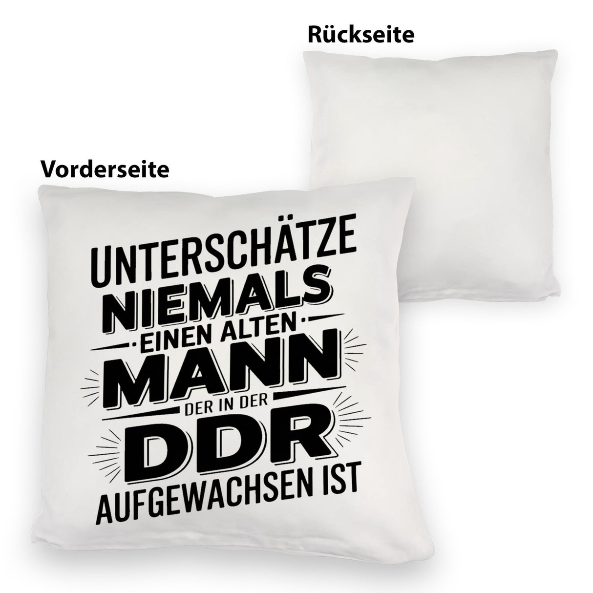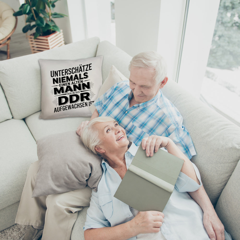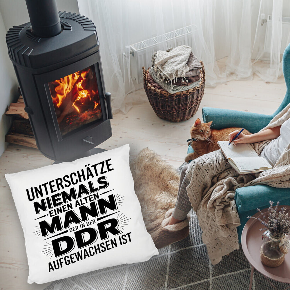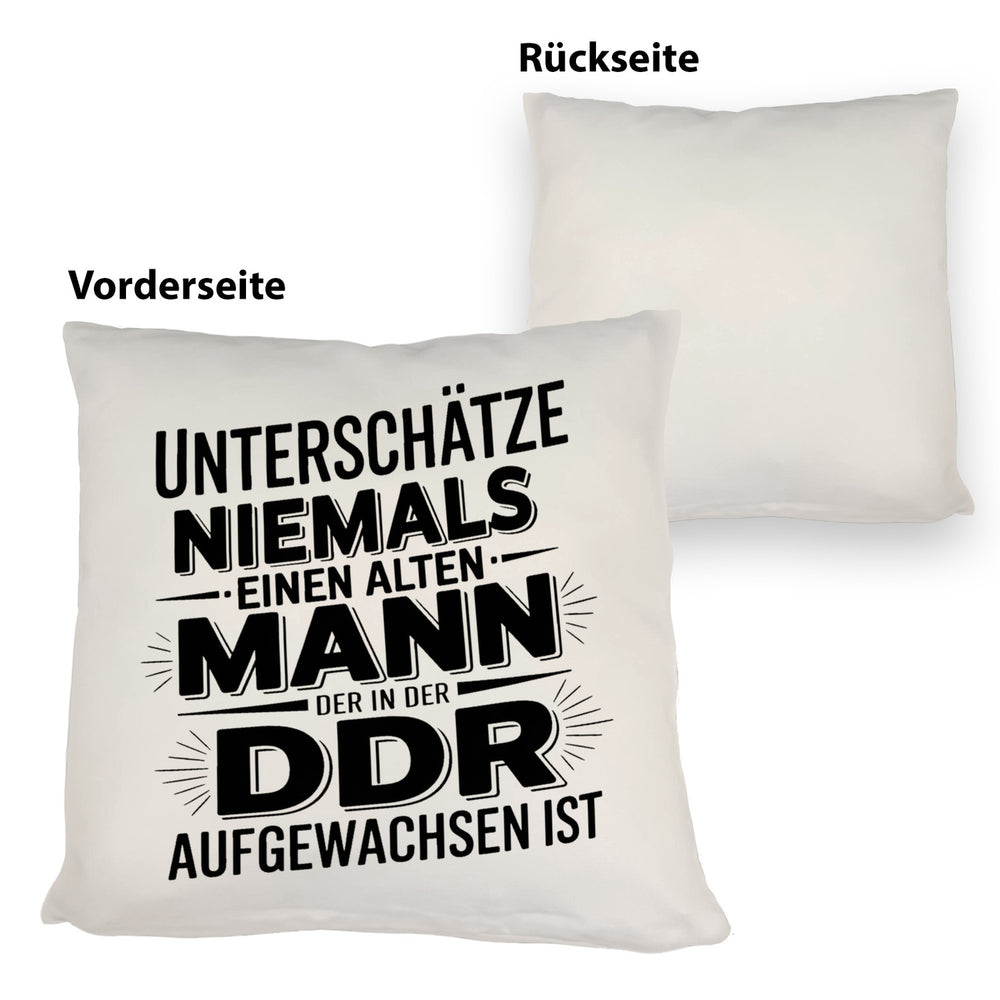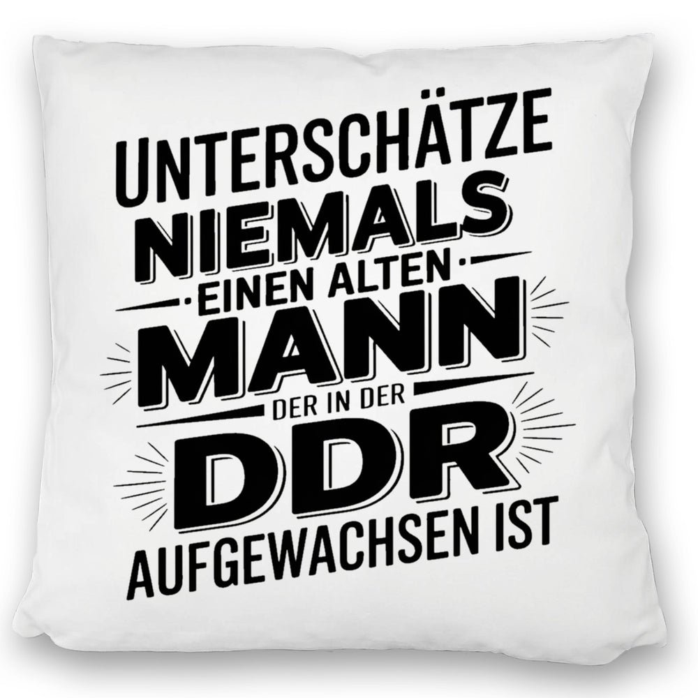 - Dieses DDR Nostalgie Sofakissen zeigt ein charmant schwarz-weißes Motiv mit dem originellen Spruch "UNTERSCHÄTZE NIEMALS EINEN ALTEN MANN DER IN DER DDR AUFGEWACHSEN IST". Die eindrucksvolle Schrift hebt sich auf einem schlichten Hintergrund ab, was einen nostalgischen Vintage-Look schafft, der Geschichte und Heimatverbundenheit zelebriert.