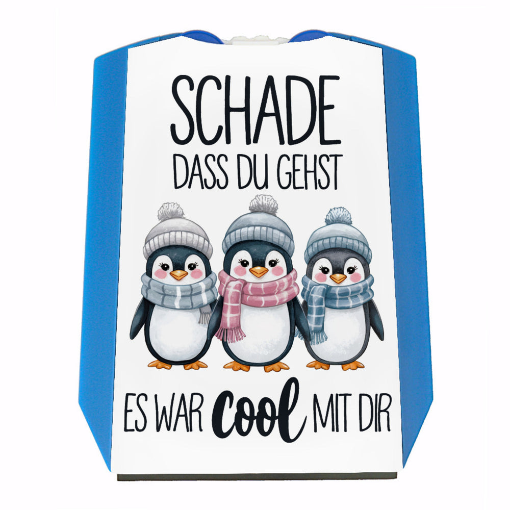 • Diese Parkscheibe ist nicht nur funktional, sondern auch ein echter Hingucker. Die drei niedlichen Pinguine sind zentral auf einem schneeweißen Hintergrund platziert. Über ihnen prangt der liebevolle Text "SCHADE DASS DU GEHST ES WAR COOL MIT DIR", denn jeder Parkplatzbesuch sollte positiv enden!