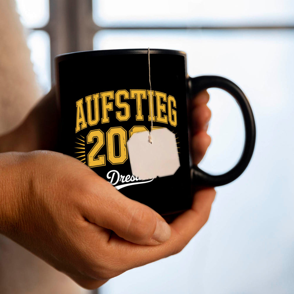 - Diese schwarze Tasse im Vintage College-Stil zeigt den beeindruckenden Text "Aufstieg 2025" in kräftigem Gelb auf einem tiefdunklen Hintergrund. Die klassische Schrift kombiniert mit subtilen, stilisierten Lichtstrahlen und dem eleganten Zusatz "Dresden" machen sie zum echten Hingucker für Fans.