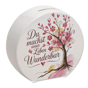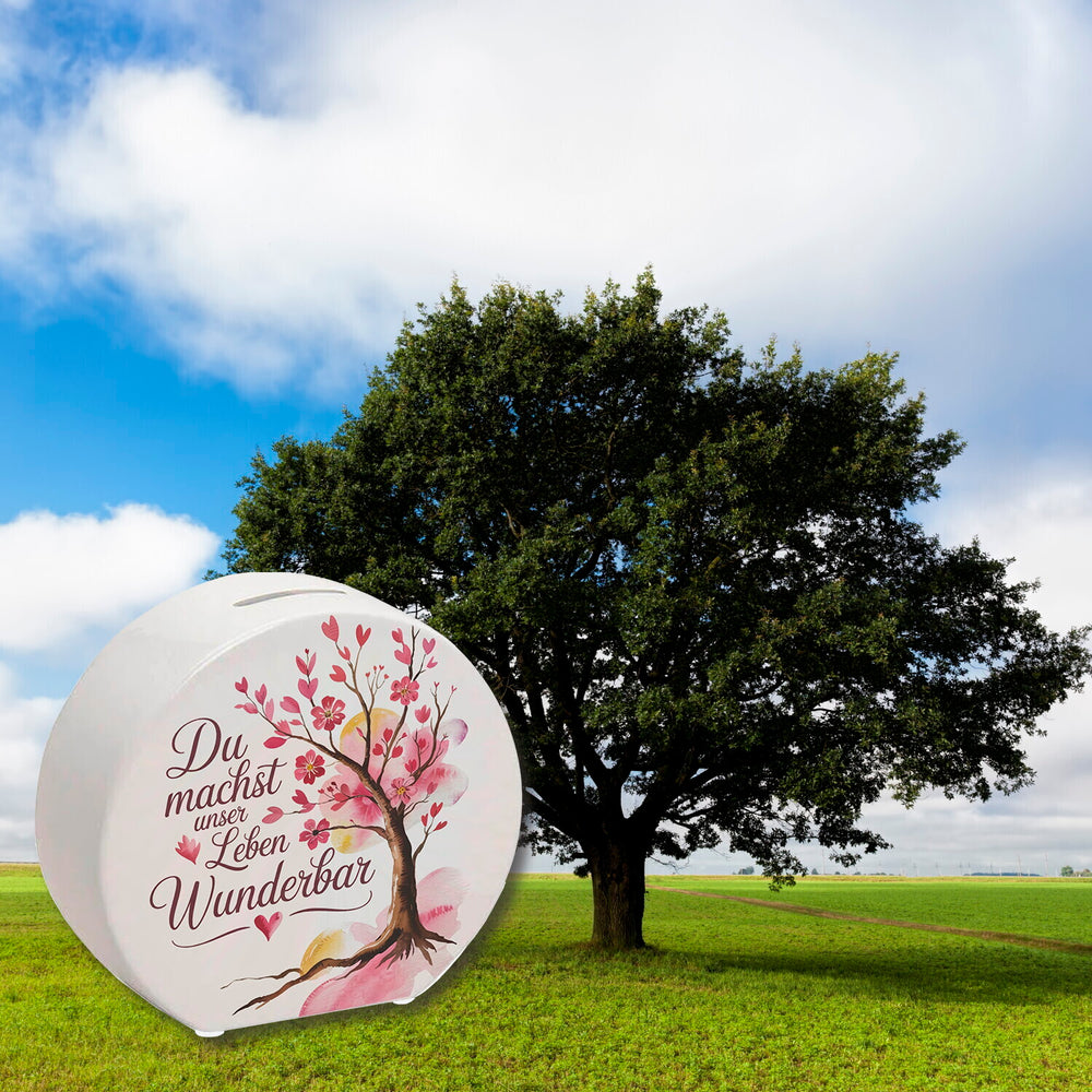 - Diese einzigartige Spardose zeigt einen lebendigen Baum, geschmückt mit rosa Blüten und Herzen als Blätter. Eingebettet in ein Aquarell von Rosa, Lila und Gelb, thront der liebevolle Satz: "Du machst unser Leben wunderbar". Ein Kunstwerk voller Farben und Emotionen, das auf einem ovalen, weißen Hintergrund erstrahlt.