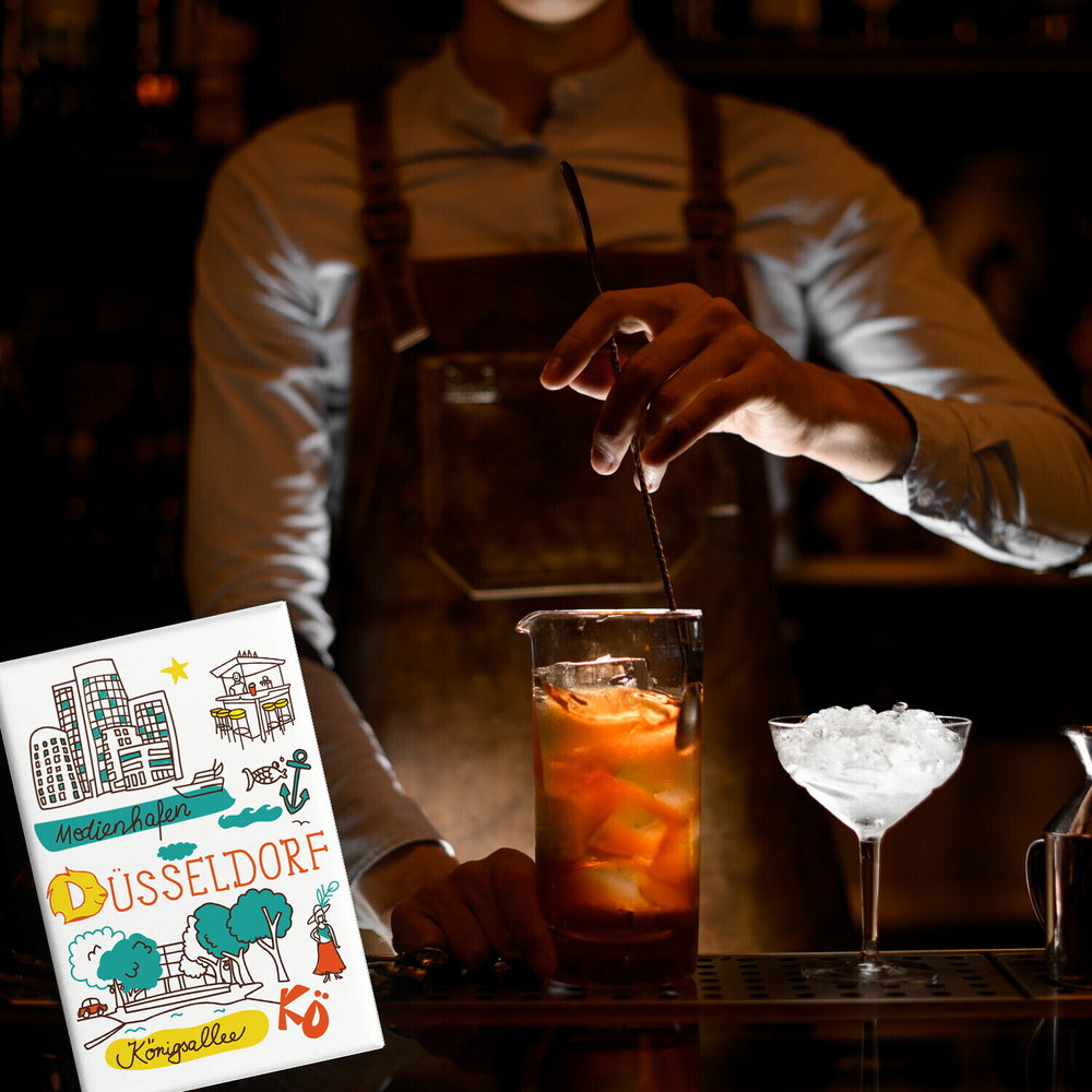 • Der eckige Düsseldorf Wimmelbild Souvenir Magnet in lebendigen Farben zeigt die Skyline mit Hochhäusern, ein Boot, eine Bar und eine elegant gekleidete Frau. Bäume und ein Auto runden das urbane Bild ab. Schriftzüge wie 'Medienhafen' und 'Königsallee' verleihen dem Motiv eine verspielte Note.