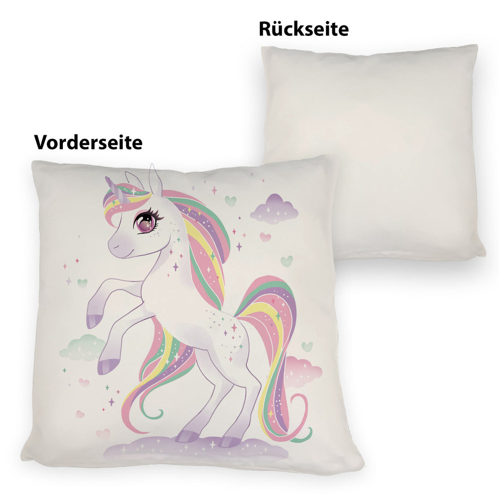 • Das niedliche Kissen mit Einhorn-Motiv ist ein echter Hingucker! Bunte Herzen, Wolken und ein zauberhaftes Einhorn schmücken das Design. Ob im Kinderzimmer oder als Dekokissen auf dem Sofa, dieses Kissen bringt Magie und Glitzer in jeden Raum. Wer kann schon einem Regenbogen-Einhorn widerstehen?