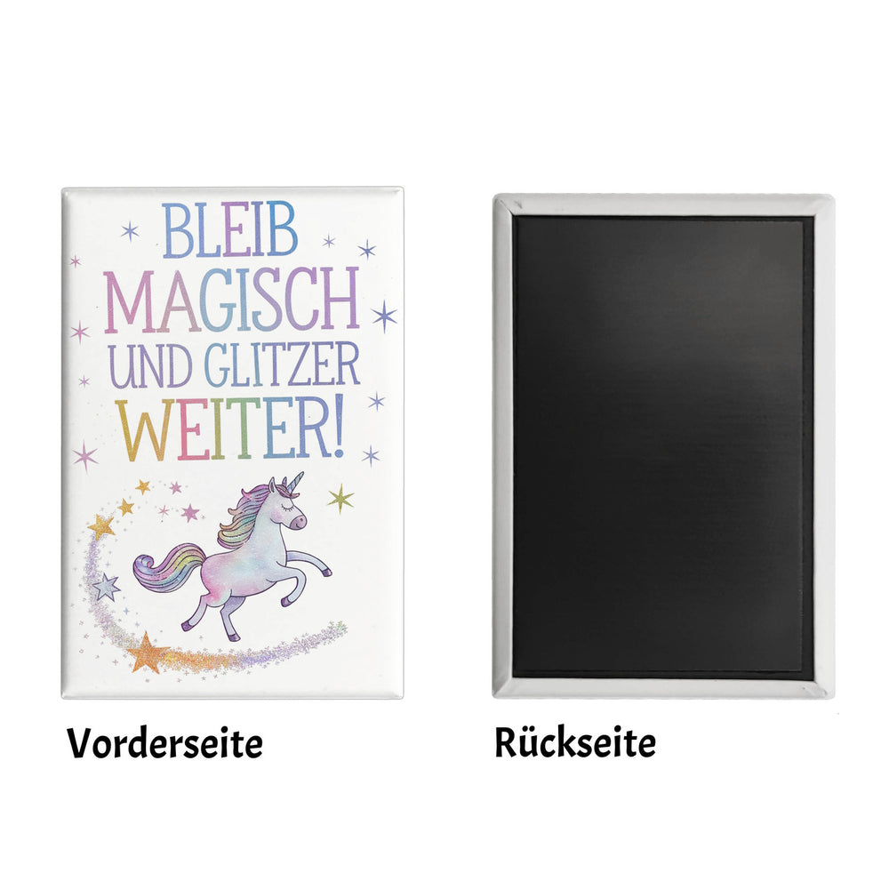 • Dieser rechteckige Souvenir Magnet zeigt ein zauberhaftes Einhorn mit einer regenbogenfarbenen Mähne, das von glitzernden Sternen umgeben ist. Auf einem weißen Hintergrund steht in großen, bunten Buchstaben der inspirierende Spruch: "Bleib magisch und glitzer weiter!". Die Kombination aus Pastell- und Metallicfarben verleiht dem Design eine magische Atmosphäre.