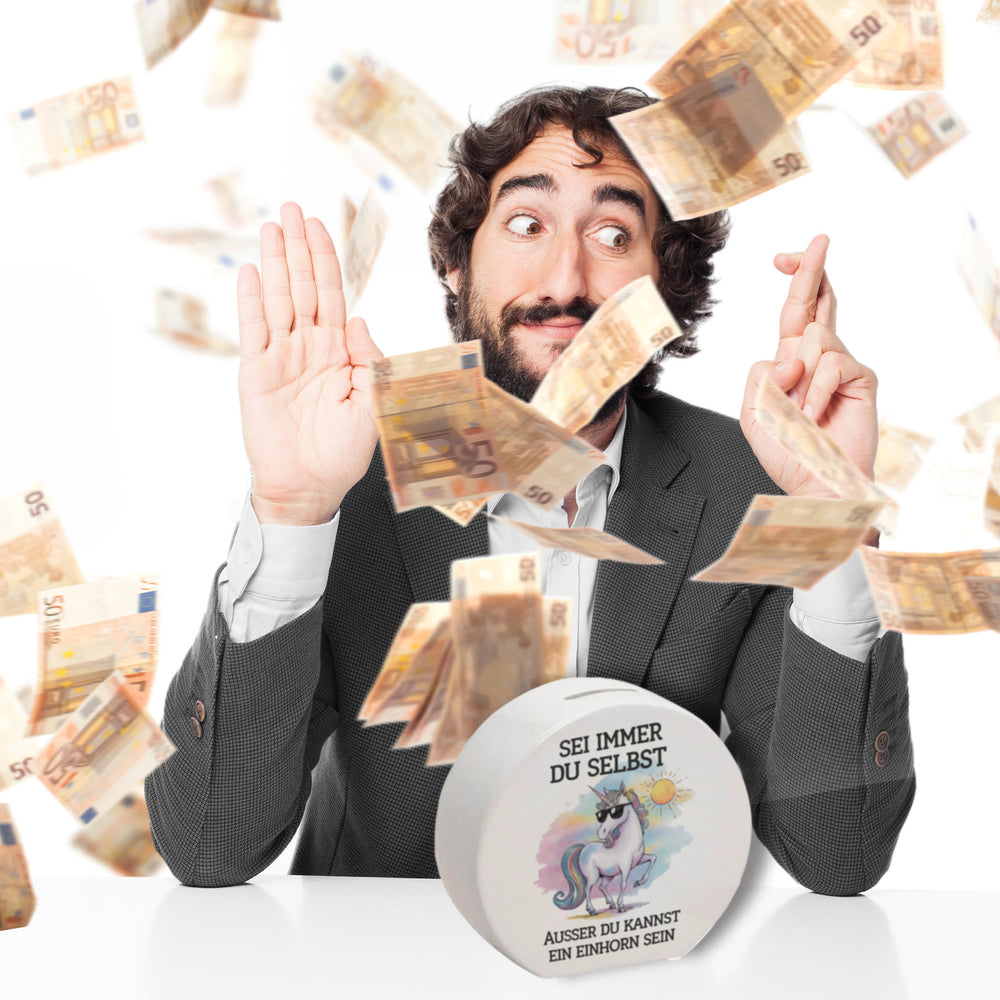 - Diese ovale Spardose zeigt ein entzückendes Einhorn mit Sonnenbrille unter einem strahlenden Himmel. In Pastellfarben gehalten, steht das Einhorn cool und selbstbewusst. Der Spruch "Sei immer du selbst. Außer du kannst ein Einhorn sein." rahmt das Design ein und sorgt für Lacher.