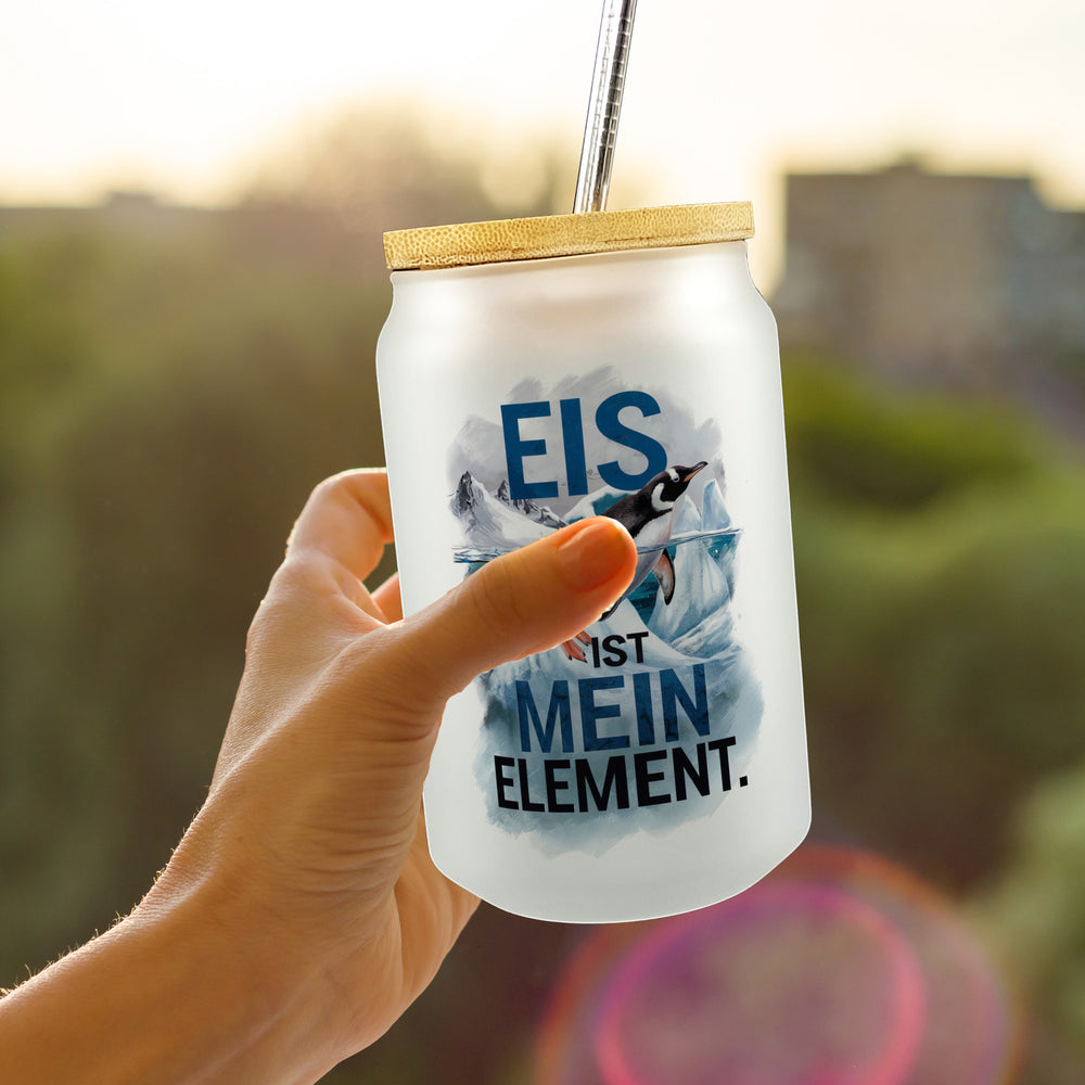 Eis ist mein Element Trinkglas mit Bambusdeckel Pinguin im Eis