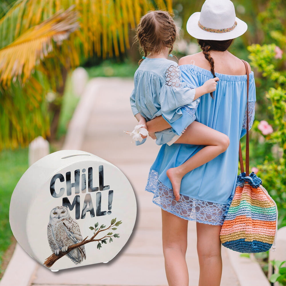 • Die Entspannte Schneeeule Spardose zeigt eine chillige Schneeeule auf einem Ast. Mit ihrem weißen Gefieder und den gelben, scharfen Augen erobert sie jedes Herz. Der Schriftzug "CHILL MAL!" in pastellfarbenem Aquarellstil gibt den humorvollen Ton an. Ein Blickfang für Eulenfans, der gute Laune verbreitet.