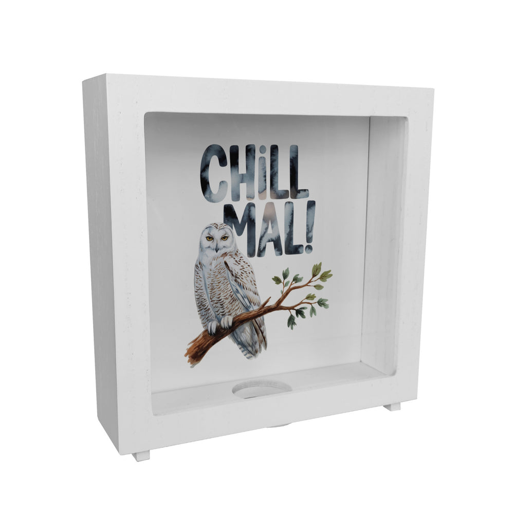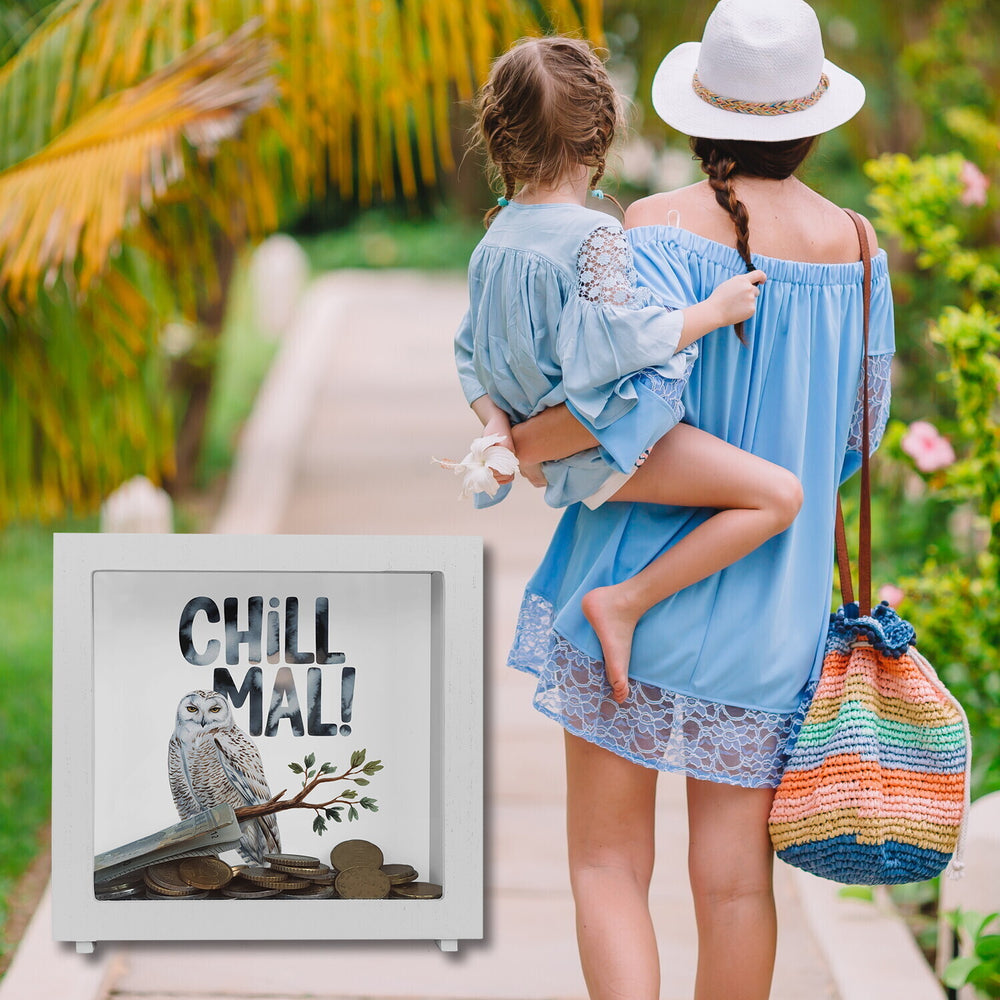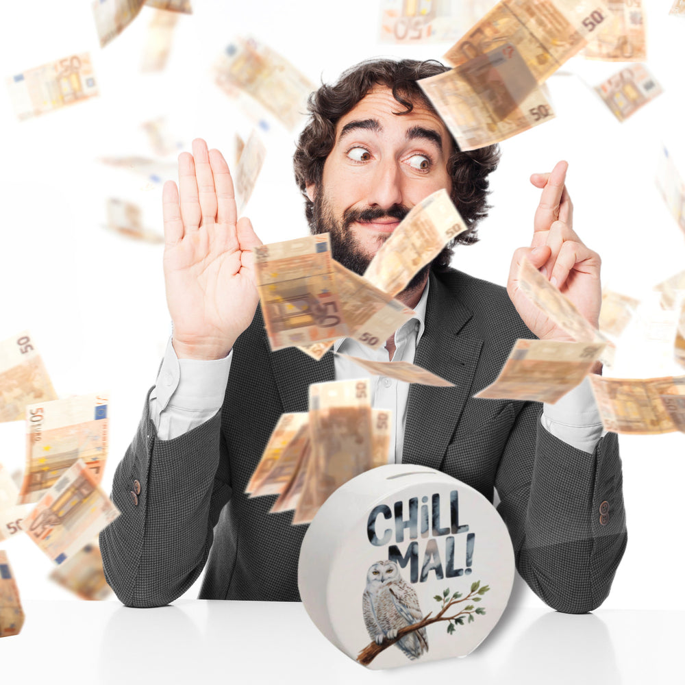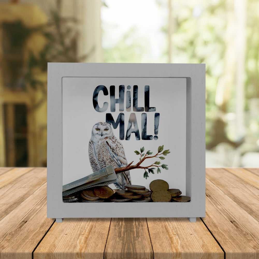 Willkommen in der Welt der Entspannten Schneeeule Chill mal Spardose – dem ultimativen Sparspaß, der Ihnen täglich ein Lächeln ins Gesicht zaubert! Diese charmante Eule ist nicht nur ein Meisterwerk der Entspannung, sondern auch ein Wächter Ihrer Ersparnisse. Mit ihrem weißen Gefieder und den strahlend gelben Augen sitzt sie lässig auf einem Ast und erinnert Sie daran, ab und zu einfach mal durchzuatmen und das Leben zu genießen.Der humorvolle CHILL MAL! Schriftzug im pastellfarbenen Aquarellstil ist nicht nur ein echter Hingucker, sondern auch die perfekte Aufforderung, den Alltag mal etwas ruhiger anzugehen. Ob als schlichte Holzvariante, elegante ovale Keramik-Ausführung oder exklusiv mit Holzrahmen und Sichtfenster – die Entspannte Schneeeule ist ein fantastisches Geschenk für Jung und Alt. Mit Liebe und Sorgfalt in unserer Spardosen-Manufaktur in Deutschland bedruckt, vereint sie Qualität mit einer Prise Humor. Ideal für Eulenfans und Sparfüchse gleichermaßen. Gönnen Sie sich diesen witzigen und dennoch stilvollen Geldwächter und sorgen Sie bei jedem Anblick für gute Laune. Denn mit der Entspannten Schneeeule wird Sparen zur echten Chill-Out-Zeit!