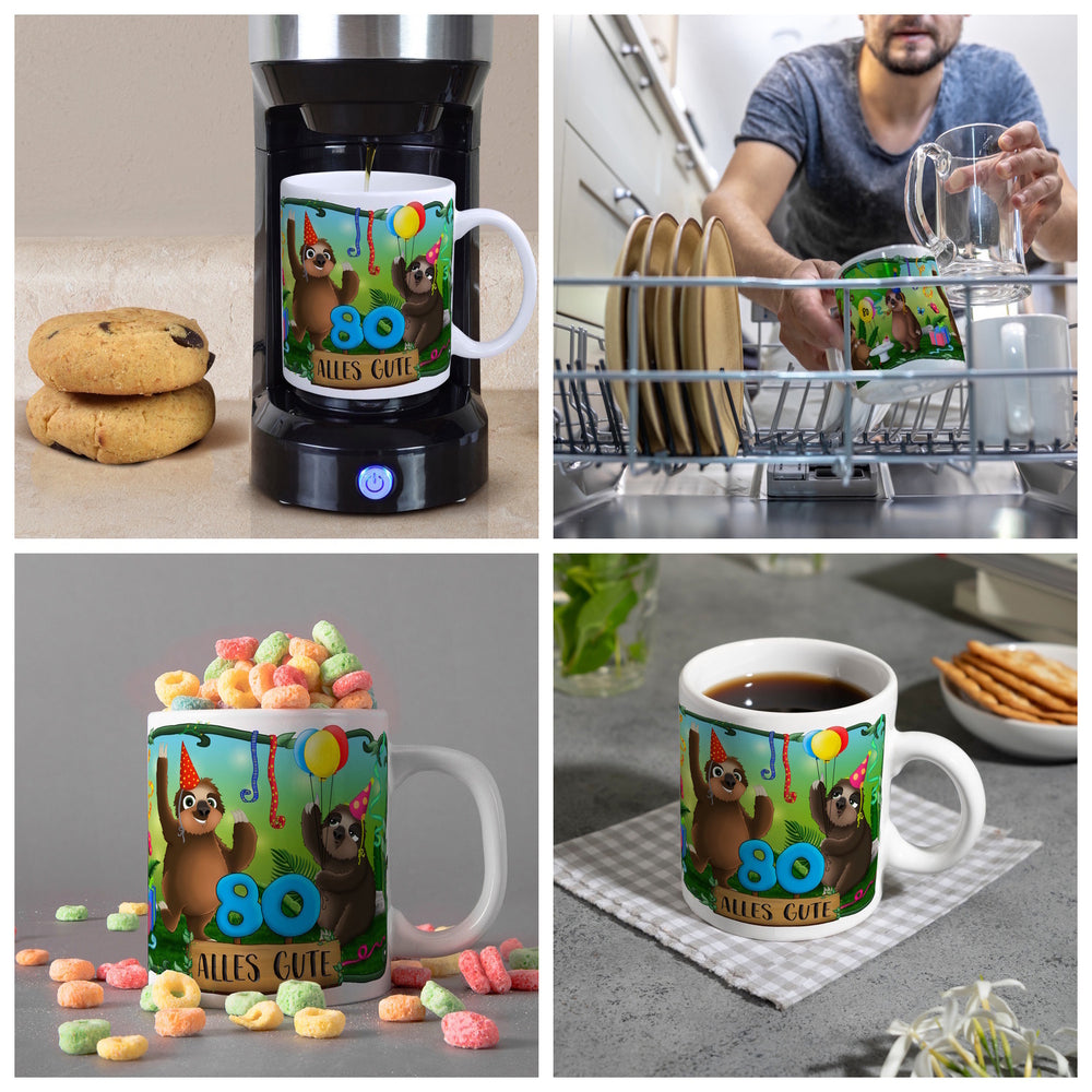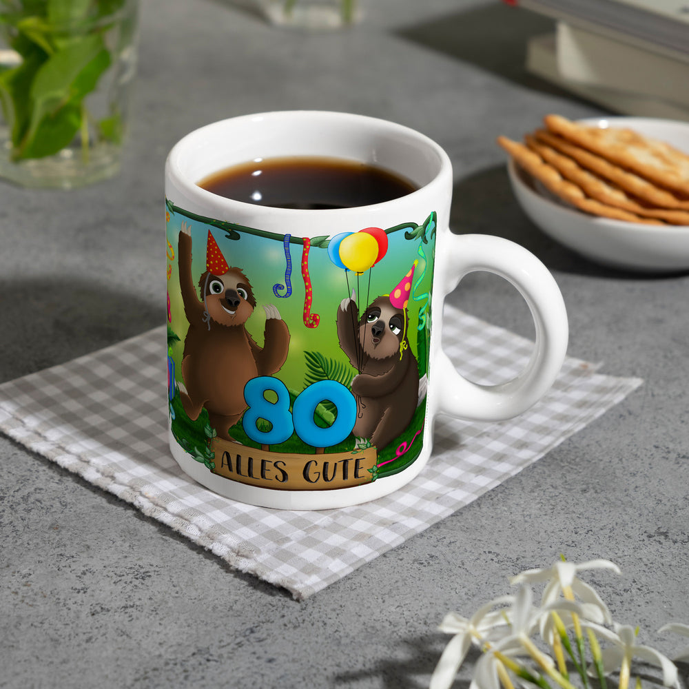 - Die Tasse zeigt eine lustige Faultier Geburtstagsparty und enthält den Schriftzug Happy Birthday und alles Gute zum 80. Geburtstag