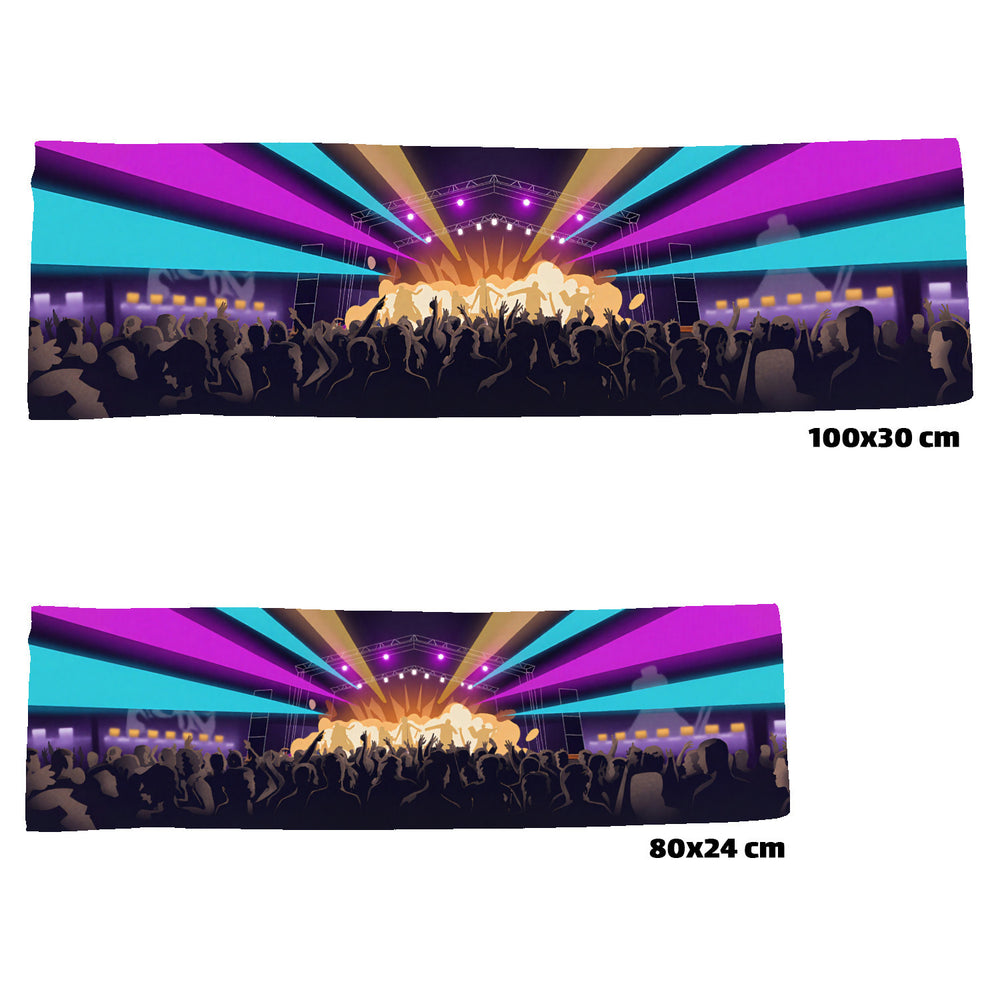 - Das Eishandtuch zeigt ein lebendiges digitales Design mit einer Musikfestivalbühne, die in dynamisches Licht getaucht ist. Farbige Lichter wie Magenta, Cyan und Bernstein durchdringen die Atmosphäre und betonen den Bühnenbereich. Die Gesichter im Publikum sind in freudiger Bewegung verschwommen, unter einem Himmel aus farbigen Lichtern.