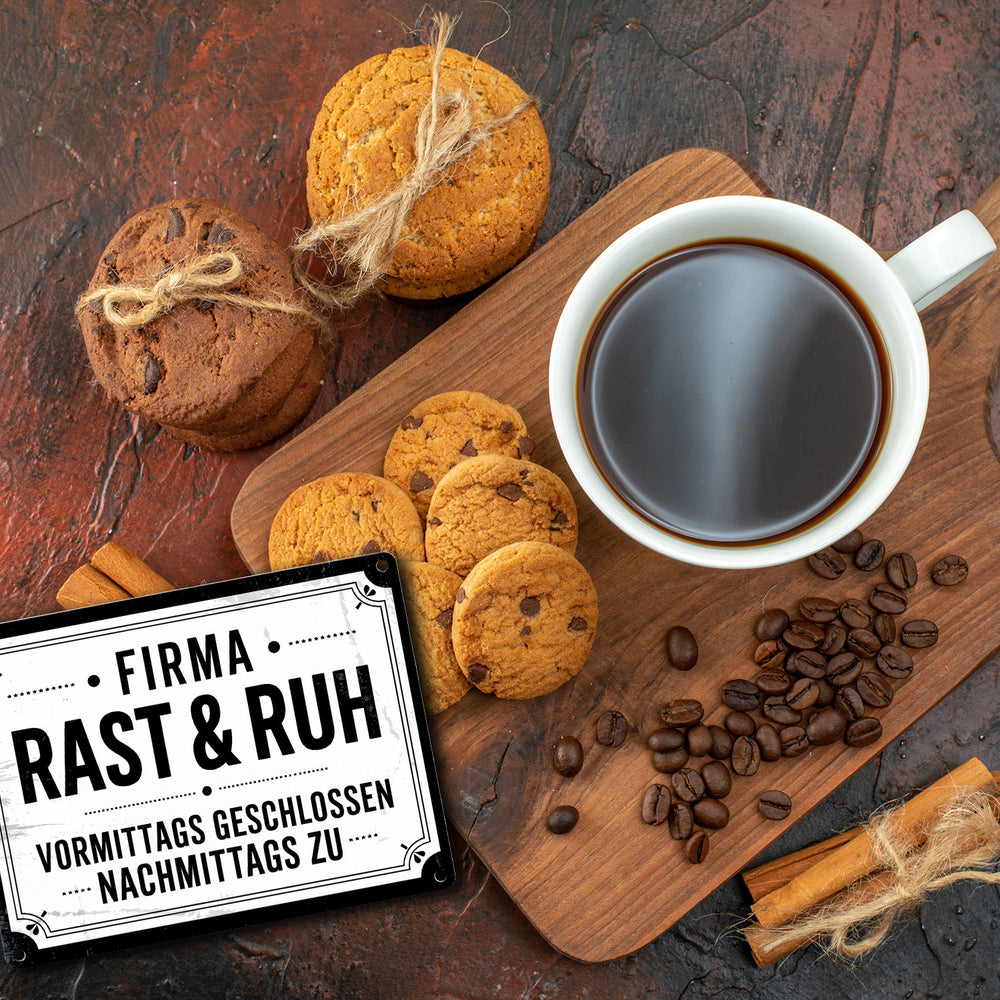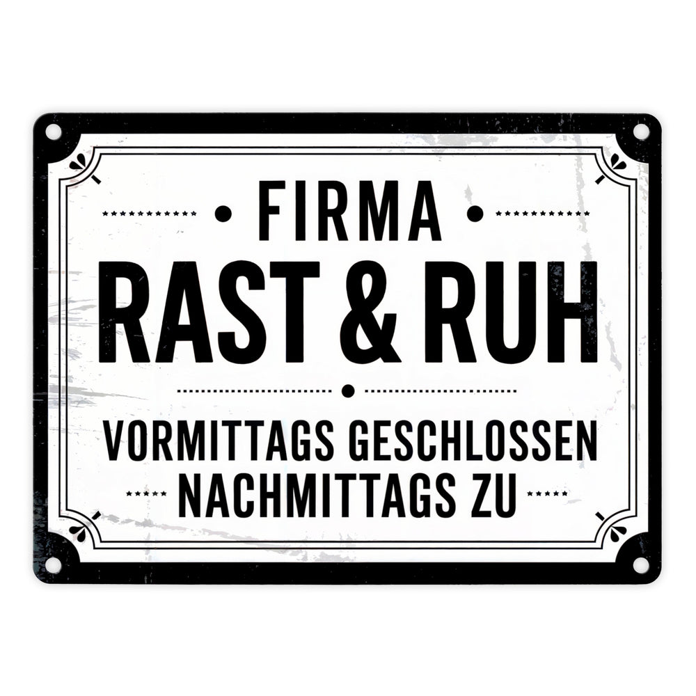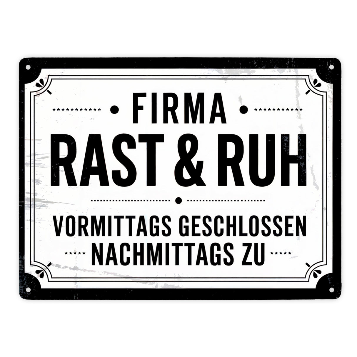 Willkommen in der charmanten Welt des FIRMA RAST und RUH Metallschilds – ein Highlight für jede Wand, das mehr Charakter und Humor in Ihr Leben bringt als ein Clown auf einem Einrad! Mit seinen klassischen Schwarz-Weiß-Farben und dem unwiderstehlichen Vintage-Charme ist dieses Schild nicht nur ein Dekorationsobjekt, sondern eine Lebenseinstellung. Die fetten Großbuchstaben erzählen stolz: Vormittags geschlossen, nachmittags zu . Schöner kann man die Daseinsfreude kaum zusammenfassen!Perfekt geeignet, um an der Wand Ihres gemütlichen Wohnzimmers, Ihrer stilvollen Küche oder gar in einem kreativen Büro zu glänzen, sorgt dieses Schild überall für ein Schmunzeln und gehobene Stimmung. Die hochwertige Verarbeitung aus Aluminiumblech mit vorgebohrten Löchern und abgerundeten Ecken macht die Montage kinderleicht und langlebig.Erhältlich in den praktischen Größen 15x20cm, 21x28cm und 28x38cm, passt es in kleinste Nischen genauso wie auf ausgedehnte Wandflächen. Ein deutsches Qualitätsprodukt, das mit viel Liebe und Sorgfalt in unserer Schilder-Manufaktur kreiert wurde. Ob als Geschenk oder Eigenbedarf – dieses Schild ist der geheime Star, der jedem Raum das gewisse Etwas verleiht!Sichern Sie sich ein Stück lachen-inspirierte Dekoration – es wird die Menschen um Sie herum erfreuen und für unvergessliche Gesprächsmomente sorgen!