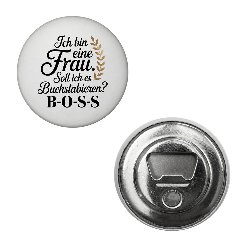 - Dieser runde Magnet "Frau ist der BOSS" vereint Eleganz und Humor. Auf einem strahlend weißen Hintergrund prahlt der selbstbewusste Spruch in femininer Schrift, begleitet von schimmernden Goldfolienakzenten. Ein goldener Lorbeerkranz krönt das Design, das Frauenpower feiert und stilvoll Empowerment verkündet. Ein wahrer Hingucker für Kühlschrank oder Büro.