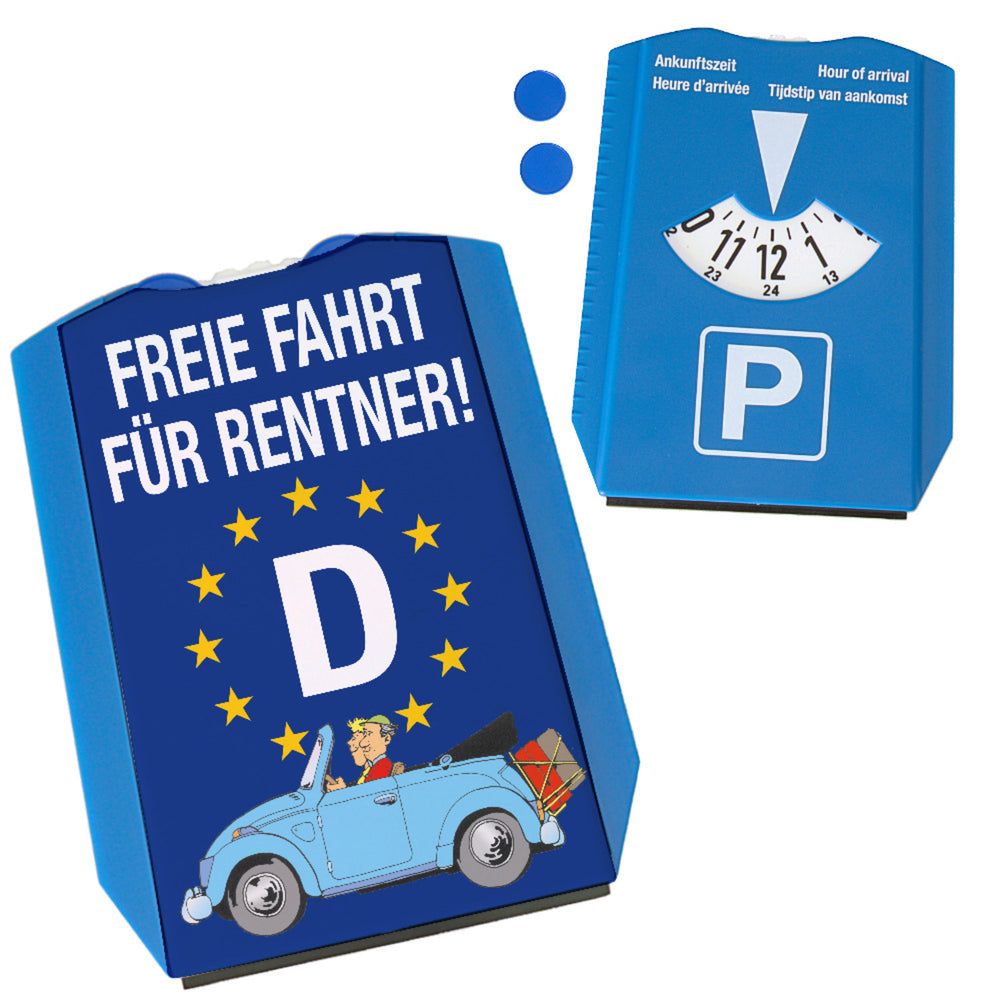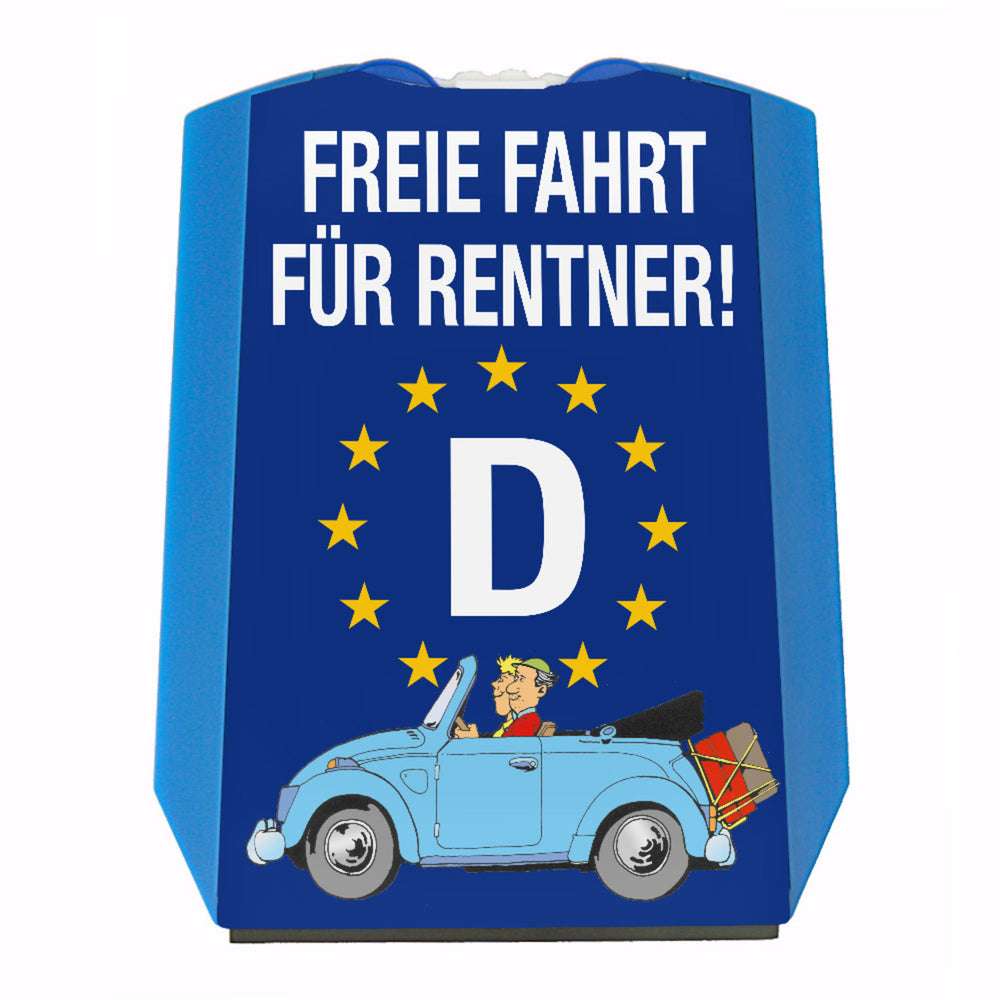 - Die Parkscheibe zeigt einen blauen Oldtimer. Zusätzlich sieht man den Spruch: Freie Fahrt für Rentner! Der Hintergrund ist blau.