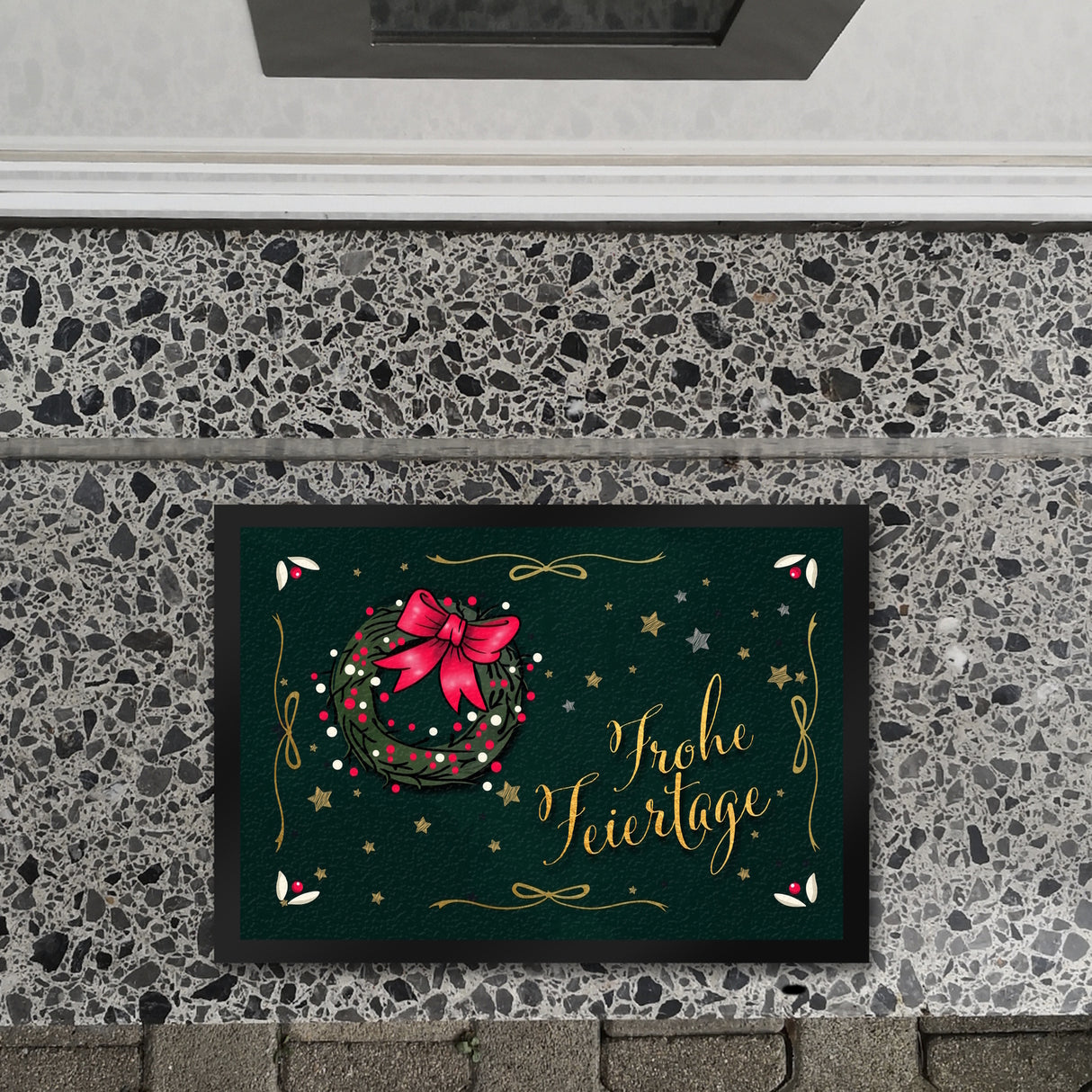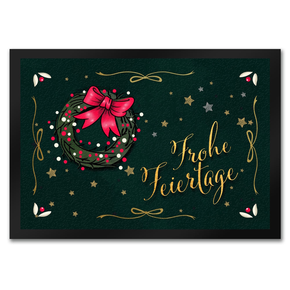 - In der schönsten Zeit des Jahres trifft man gerne auf Freunde und Familie und feiert gemeinsam Weihnachten. Mit dieser wunderschönen Fußmatte kannst du deinen Gästen zur Weihnachtszeit auch schon vor deiner Haustüre mit 'Frohe Feiertage' begrüßen.