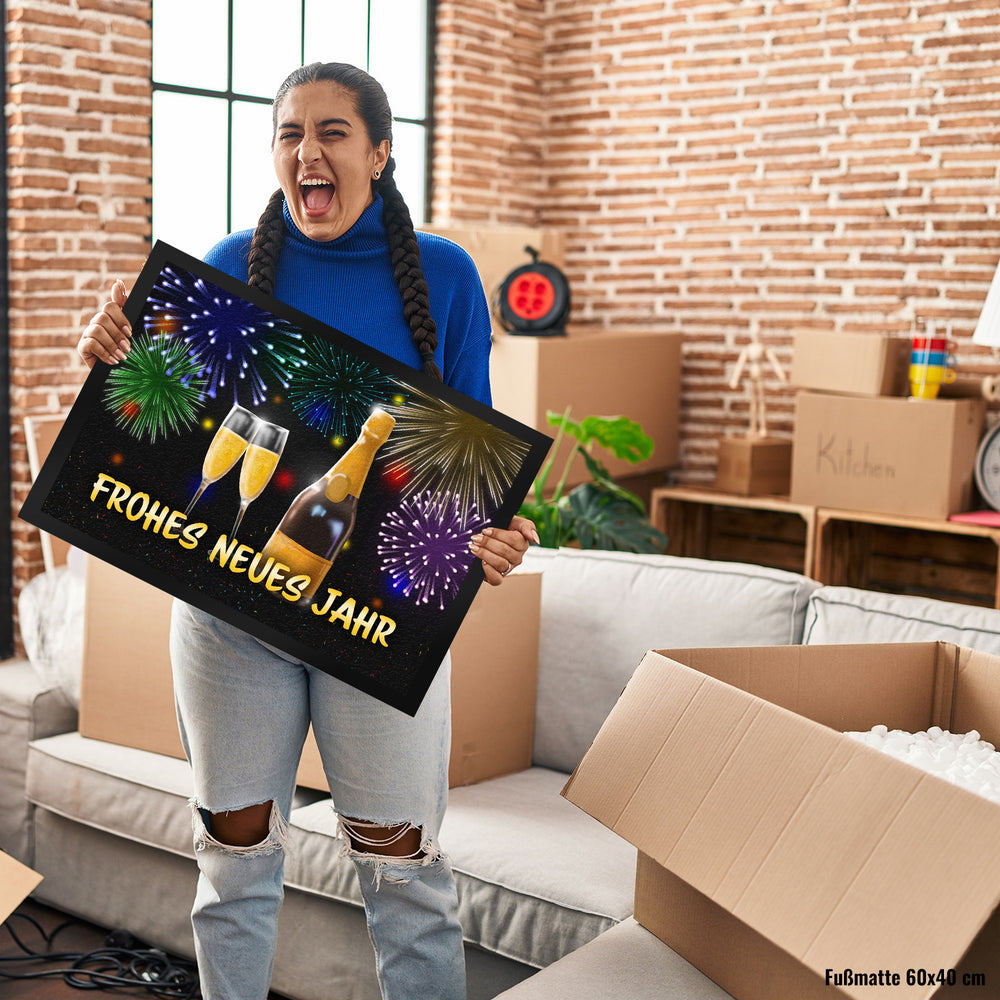 Frohes neues Jahr Fußmatte mit Sekt und Feuerwerk