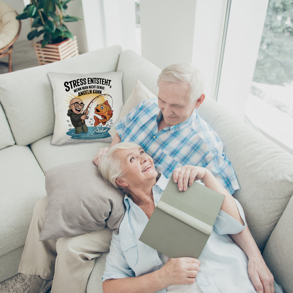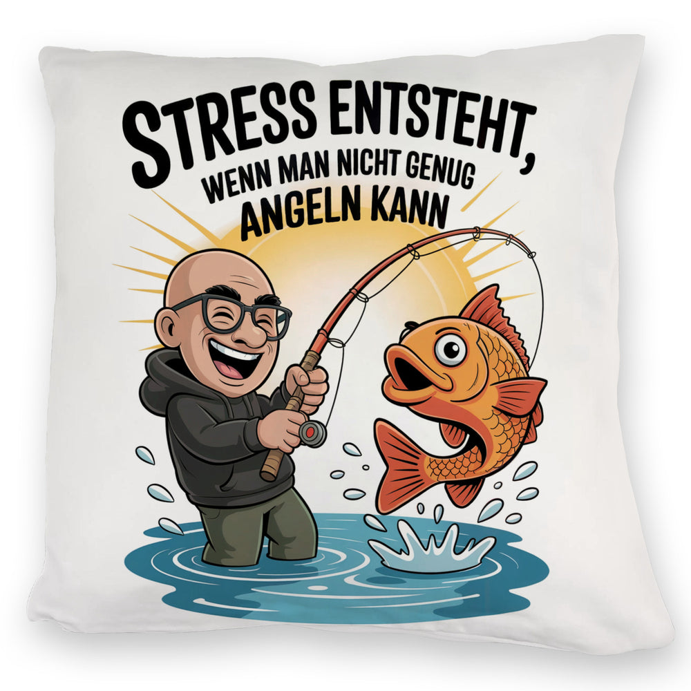 - Dieses Kissen zeigt einen fröhlichen Cartoon-Angler mit Glatze, Brille und schwarzem Hoodie, der seine Angelrute auswirft. Ein verspielter, orangefarbener Fisch springt dynamisch aus dem Wasser. Der Spruch "Stress entsteht, wenn man nicht genug angeln kann" in verspielter Schrift rundet die humorvolle Szene auf weißem Hintergrund ab.