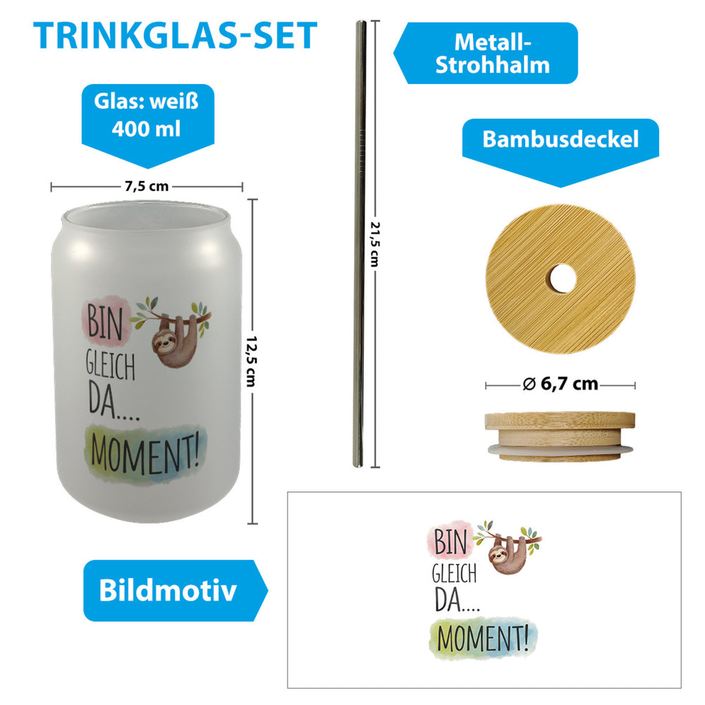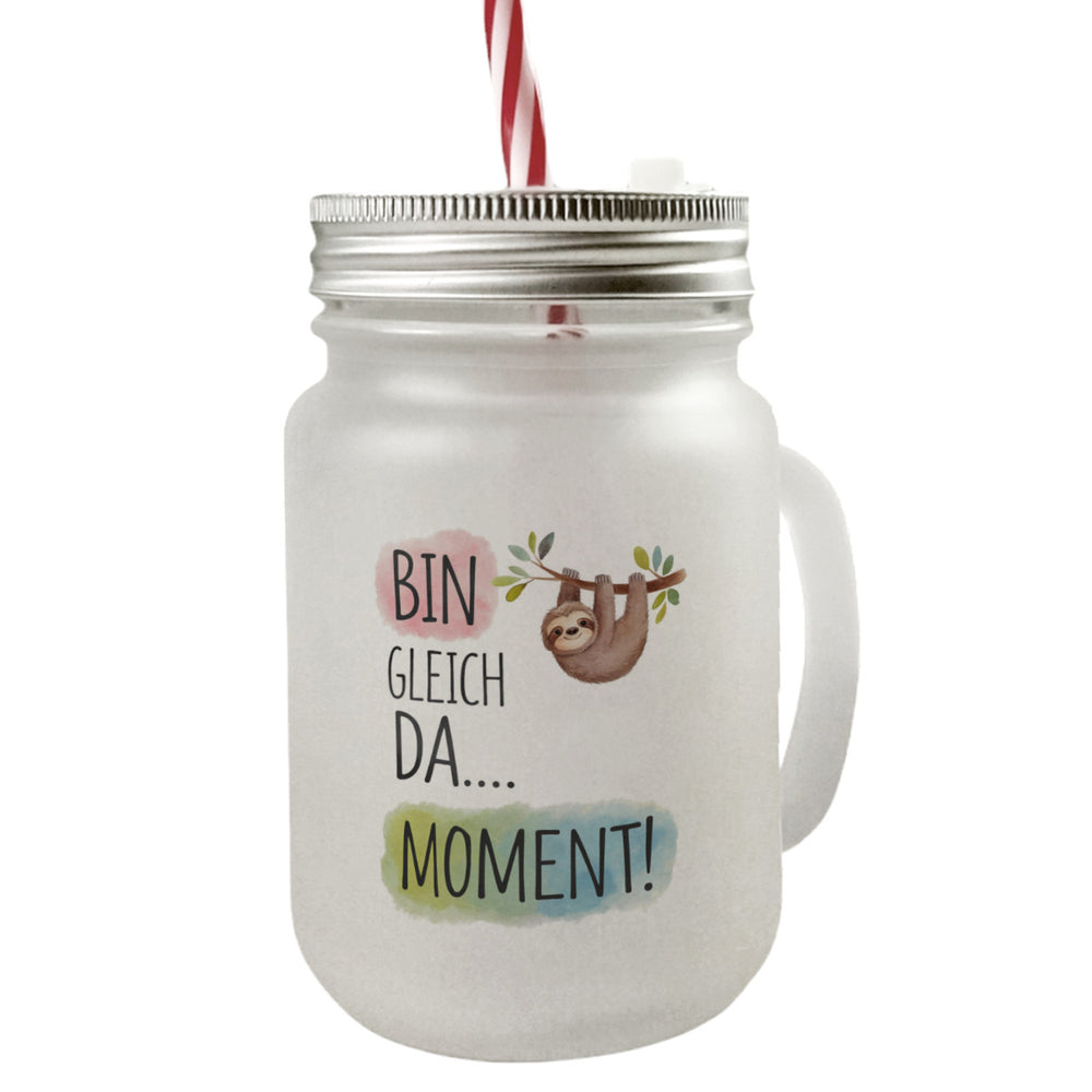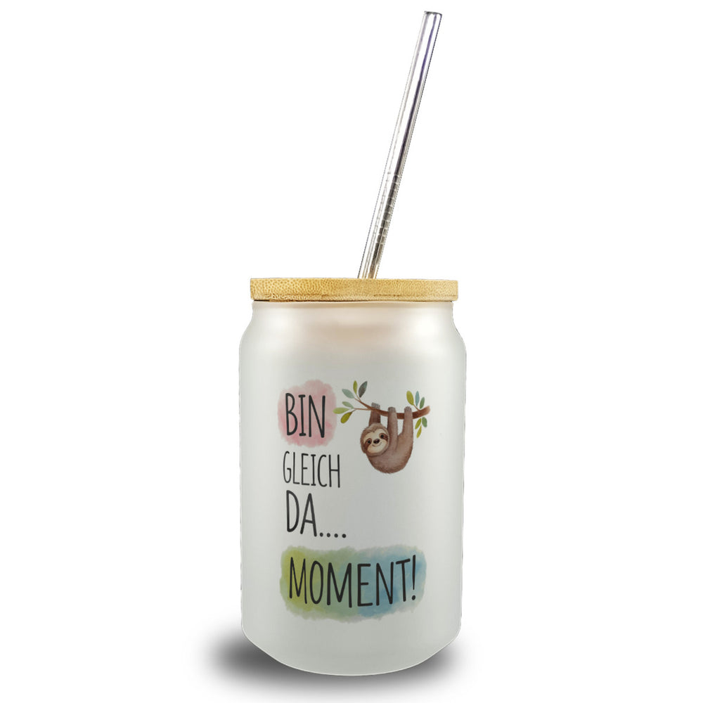 - 1x Fröhliches Faultier Bin gleich da Trinkglas mit Bambusdeckel mit Bambusdeckel oder Henkel