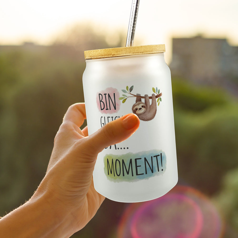- Hol dir das „Bin gleich da... Moment!“ Trinkglas, das mit Liebe zum Detail gestaltet und bedruckt wurde. Genieße die Qualität und das charmante Design, das jeden Schluck zu einem besonderen Moment macht. Perfekt für alle, die Humor und Entspannung schätzen. Lass das lustige Faultier deinen Alltag erhellen!