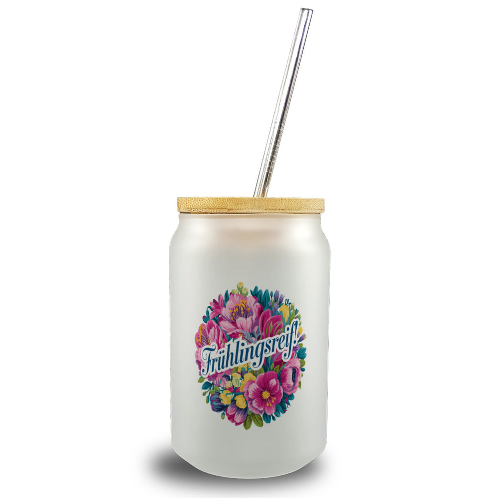 • 1x Frühlingsreif Blumendesign Trinkglas mit Bambusdeckel mit Bambusdeckel oder Henkel