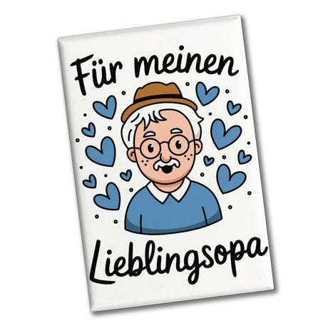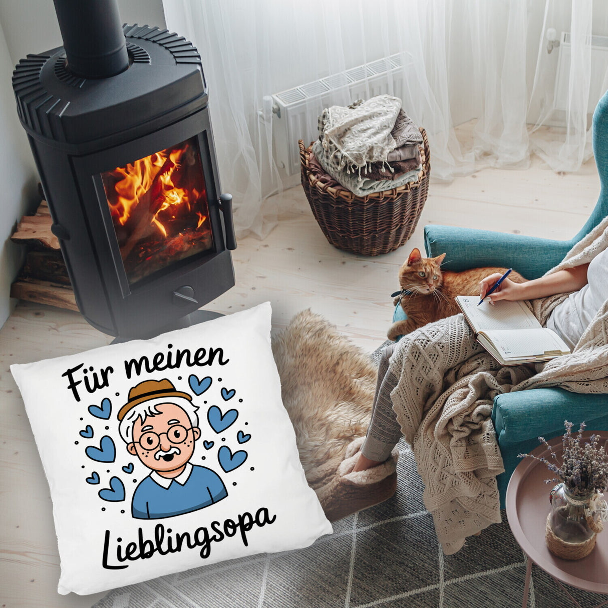 - Stellen Sie sich ein Kissen vor, das mit einem zauberhaften cartoonartigen Design eines fröhlichen Mannes mit weißen Haaren und Brille geschmückt ist. Er trägt einen blauen Pullover und Hut, umgeben von blauen Herzen und Punkten. Der liebenswerte Spruch "Für meinen Lieblingsopa" verleiht dem Kissen eine persönliche Note.