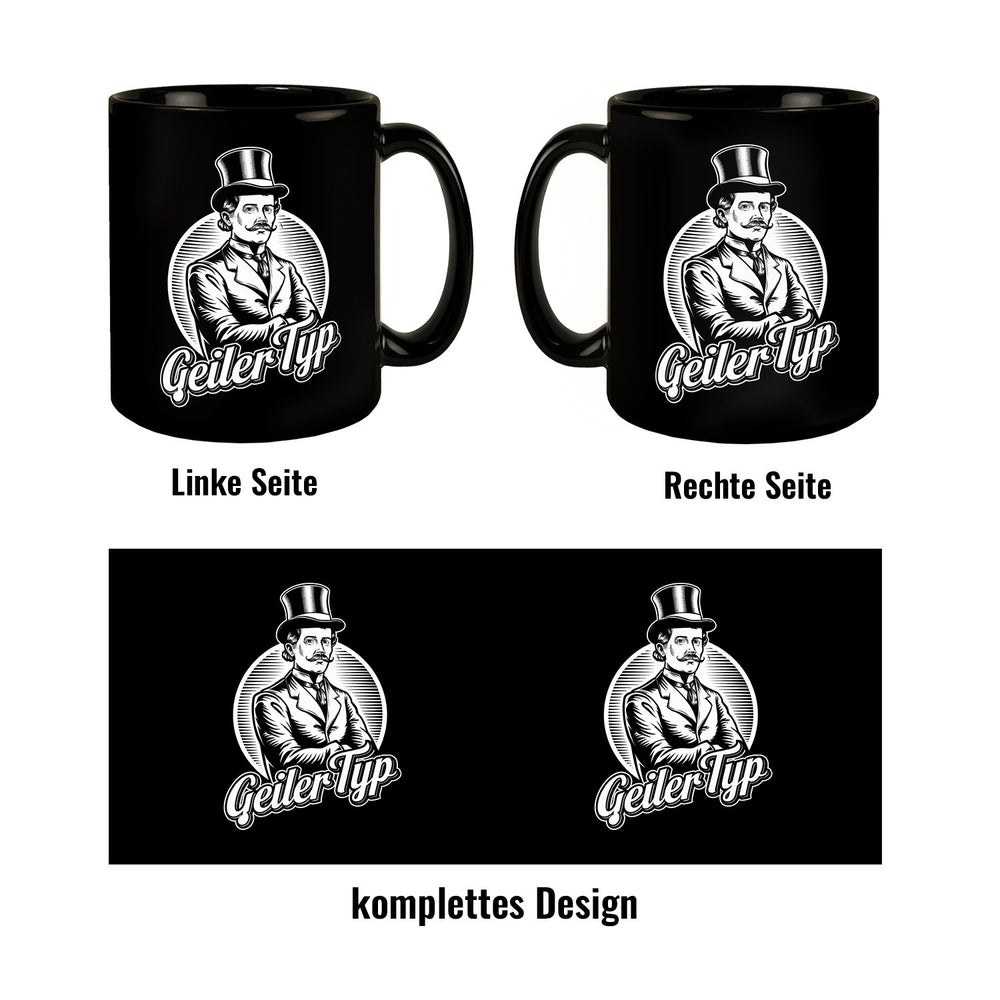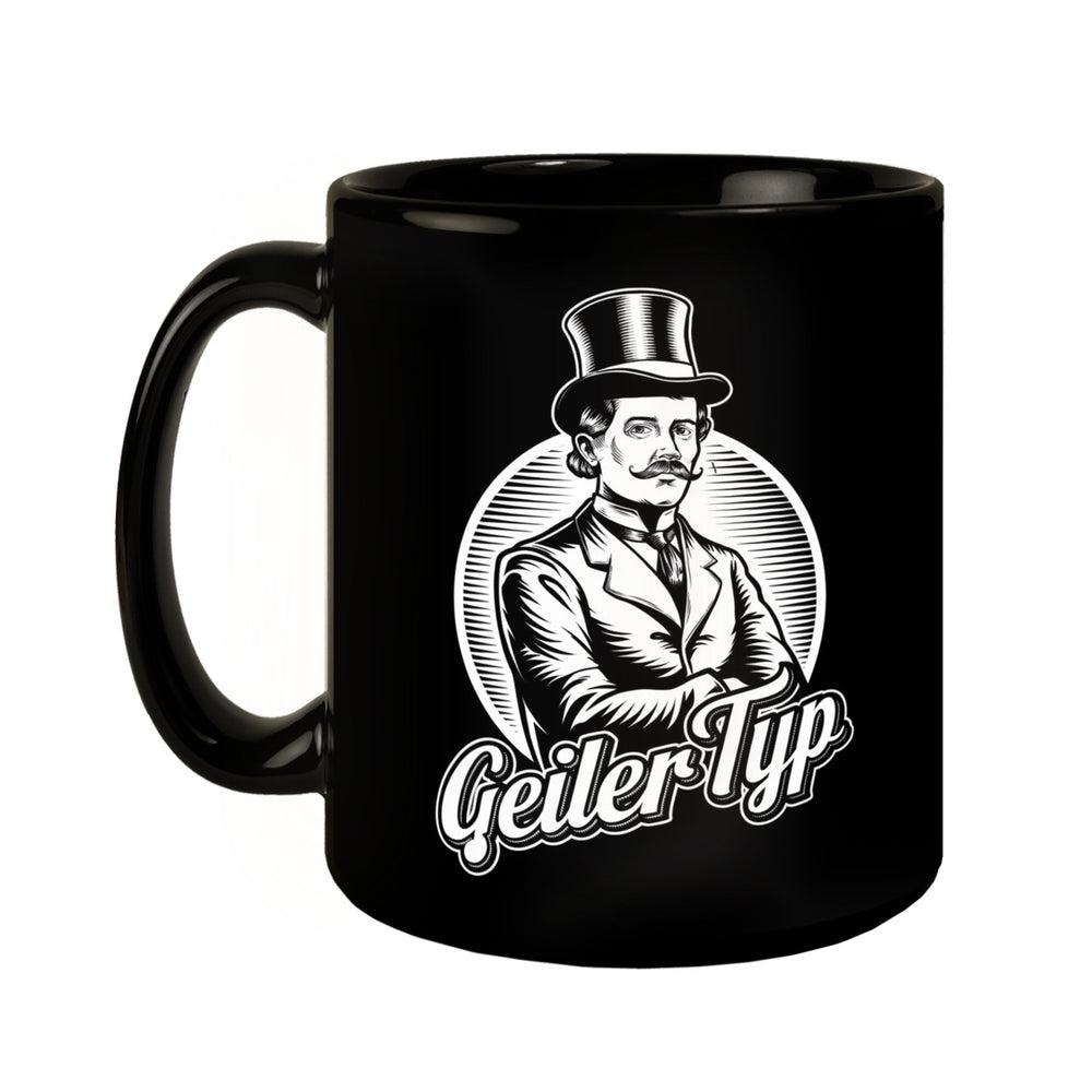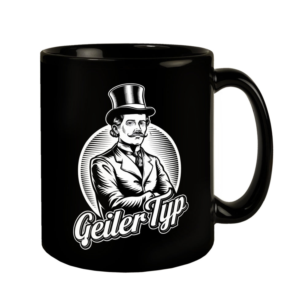 - Diese stylische schwarze Tasse zeigt eine schwarz-weiße Illustration eines Mannes mit Schnurrbart und Zylinder. Er strahlt Selbstbewusstsein im Anzug aus, begleitet von dem kühnen Spruch "Geiler Typ". Ein perfekter Hingucker für den täglichen Kaffeegenuss. Der elegante Gentleman verleiht jedem Schluck Kaffee ein nostalgisches Vintage-Feeling!