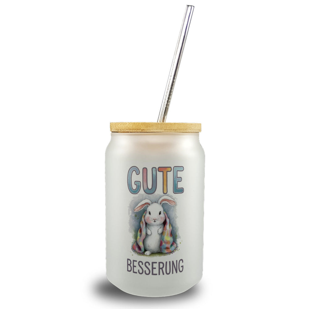 Gute Besserung Trinkglas mit Bambusdeckel - Weißes Kaninchen in einer Decke