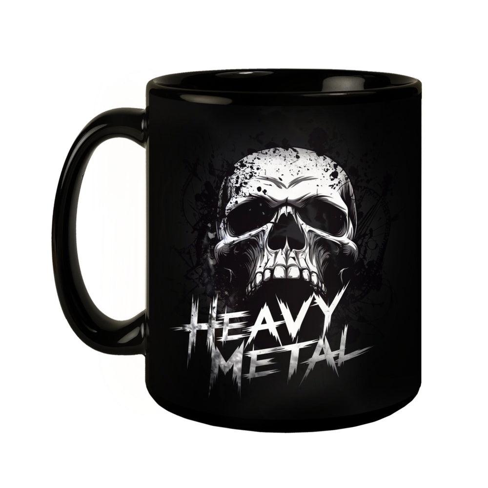 - Der Kaffeebecher präsentiert einen markanten Schädel, der aussieht, als wäre er gerade einem Farbexperiment entkommen. Dieser verleiht dem Becher ein verwittertes, chaotisches Aussehen und wird von abstrakten Mustern umrahmt, die den Heavy-Metal-Look abrunden. Unten prangt der Schriftzug 'Heavy Metal' in fetten, kantigen Buchstaben.