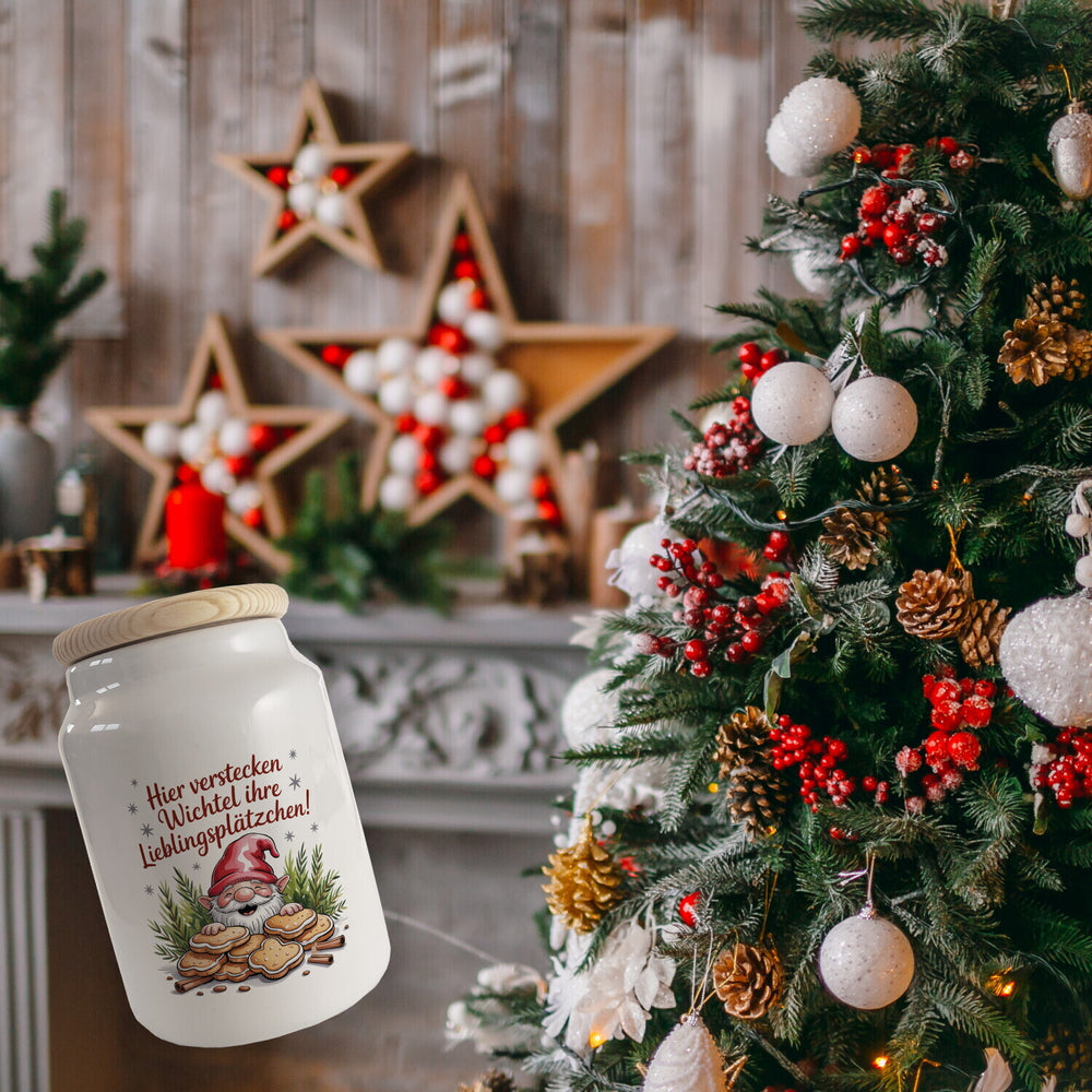 Die fröhliche Wichtel-Keksdose verzaubert mit einem bezaubernden Aquarellmotiv. Ein lächelnder Wichtel mit rotem Hut versteckt sich zwischen Lebkuchenplätzchen und Miniaturtannen. Der handgeschriebene Spruch "Hier verstecken Wichtel ihre Lieblingsplät Hinweise: Material: Keramik und Holz / Volumen 650 ml